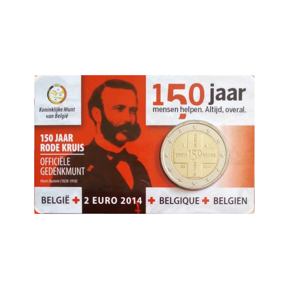Commemorative 2 Euro coin of Belgium, issued in 2014. This collector's euro coin was issued on the occasion of the 150th anniversary of the founding of the Red Cross.