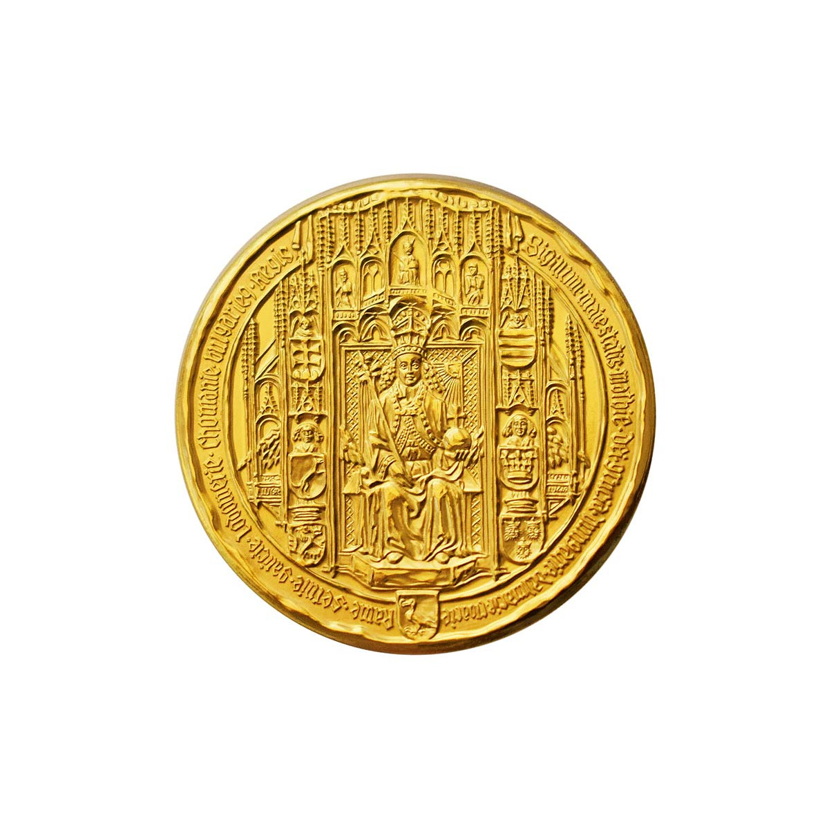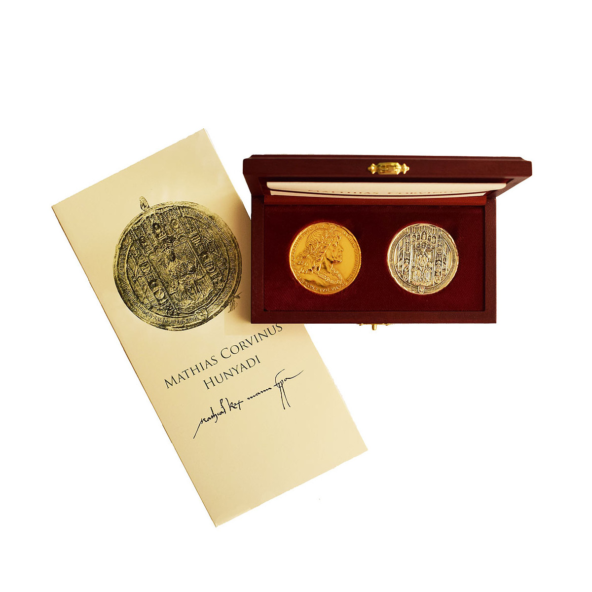 Set of gold and silver medals with the motif of the historical Great Seal of Matthias Corvinus and his portrait made of Ag 999/1000 and Au 986/1000 fineness.