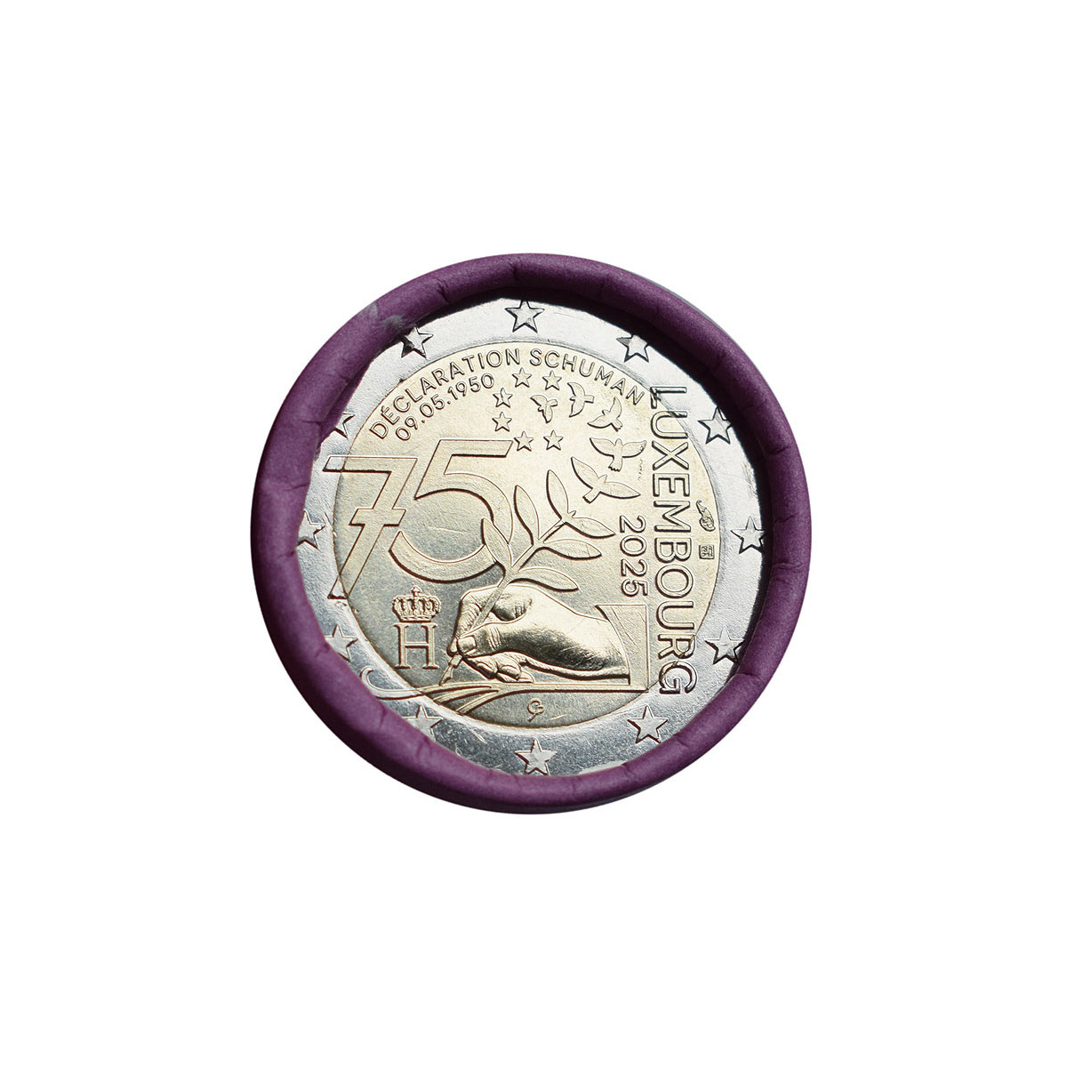 Commemorative 2 Euro coin of Luxembourg, issued in 2025. This collector euro coin was issued on the occasion of the 75th anniversary of the Schuman Declaration.