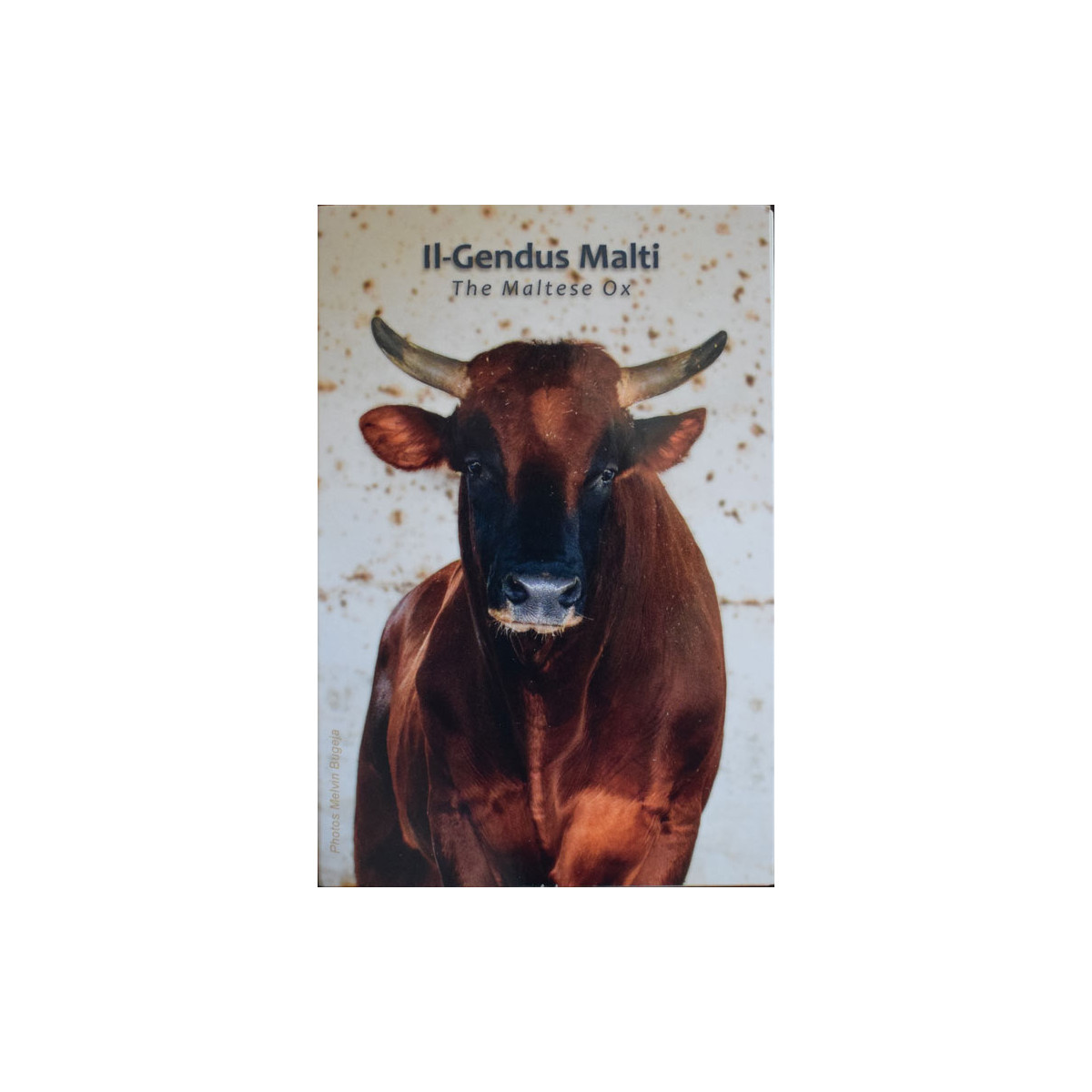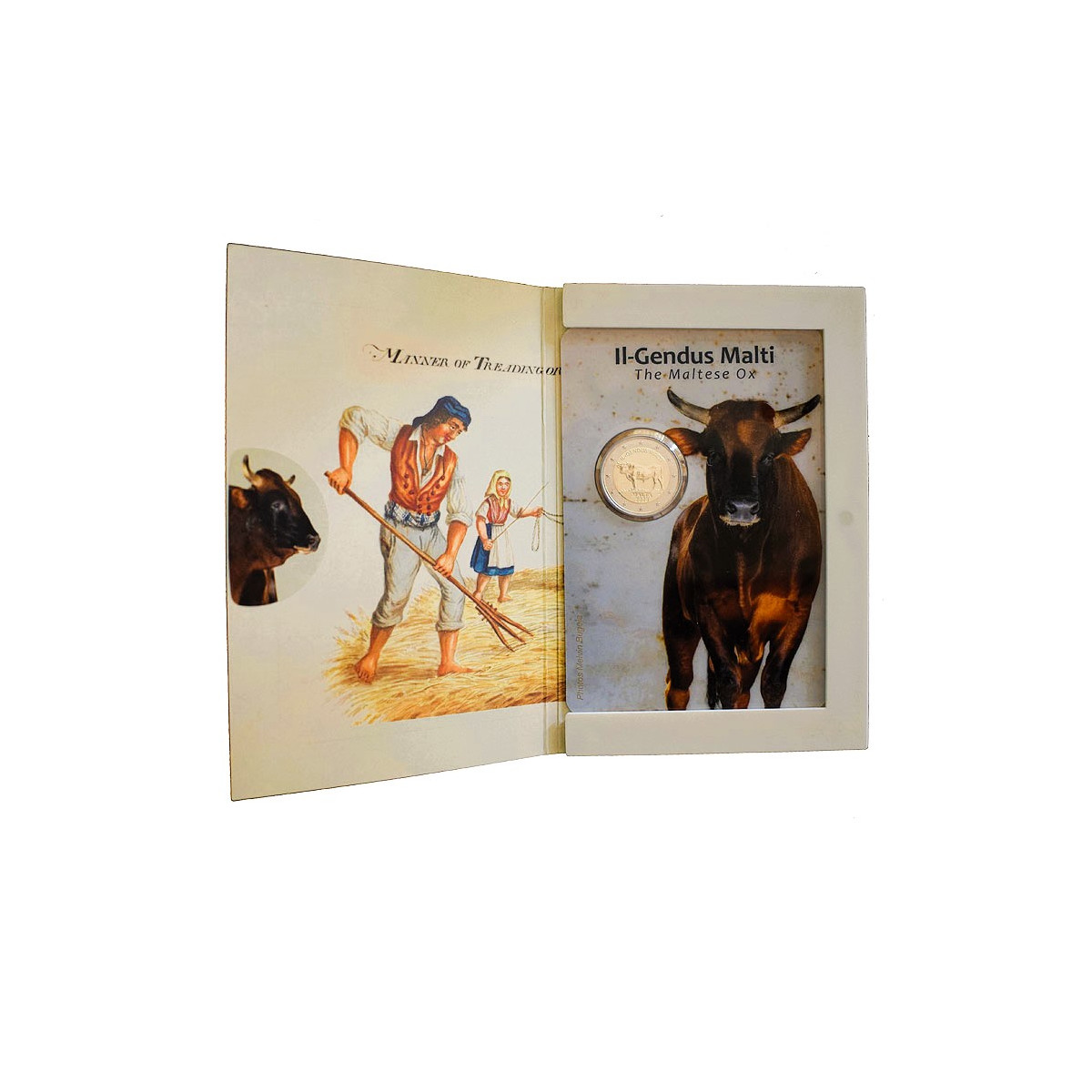Commemorative 2 Euro coin of Malta, issued in 2025. This collector's euro coin was issued with the motif of the historic Maltese cattle breed Il Ġendus Malti - a strong ox standing on grass, coin card.