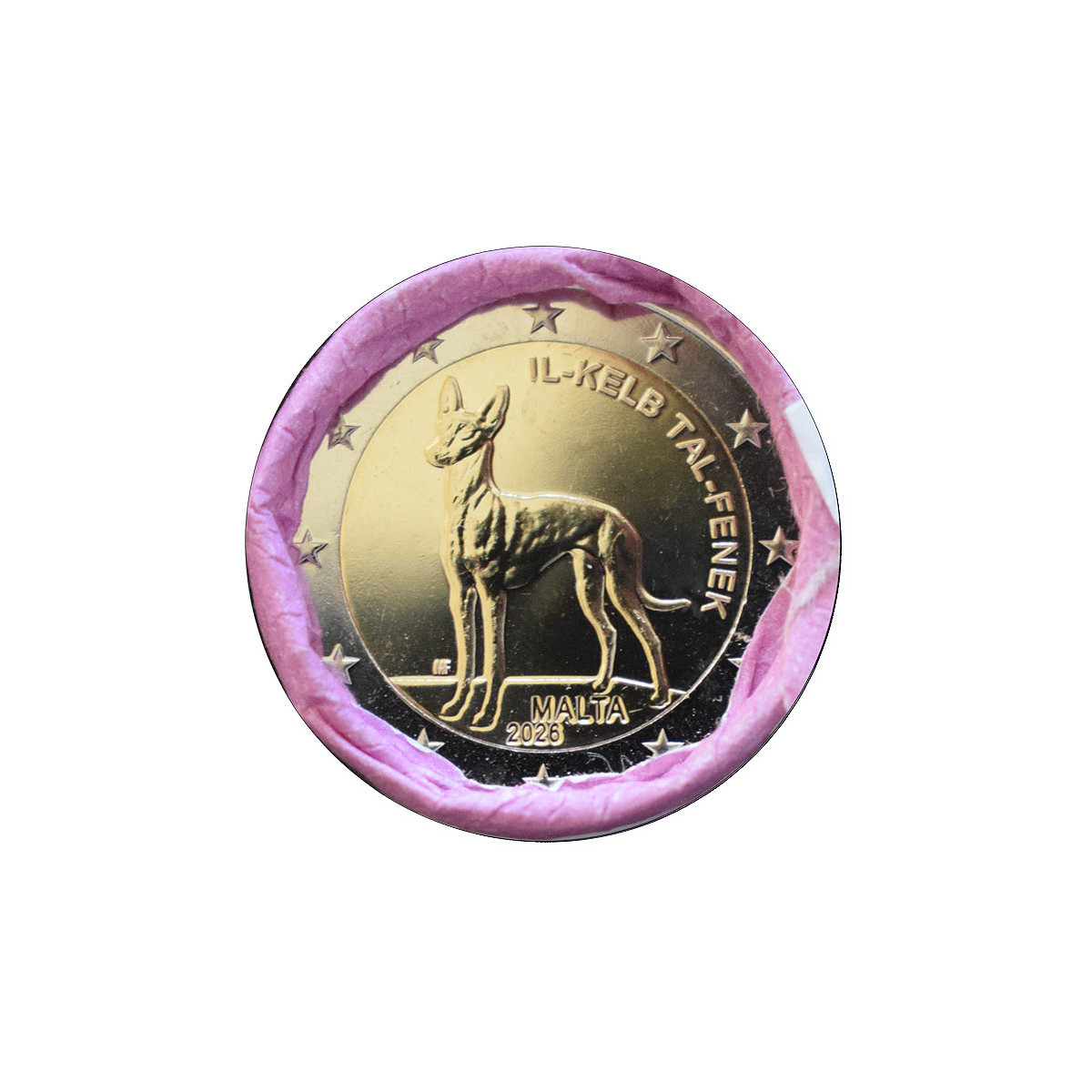 Commemorative 2 Euro coin of Malta, issued in 2026. This collector euro coin is dedicated to the Pharaoh Hound (Il-Kelb tal-Fenek). The coin is another in the series "Native Animal Species of Malta".