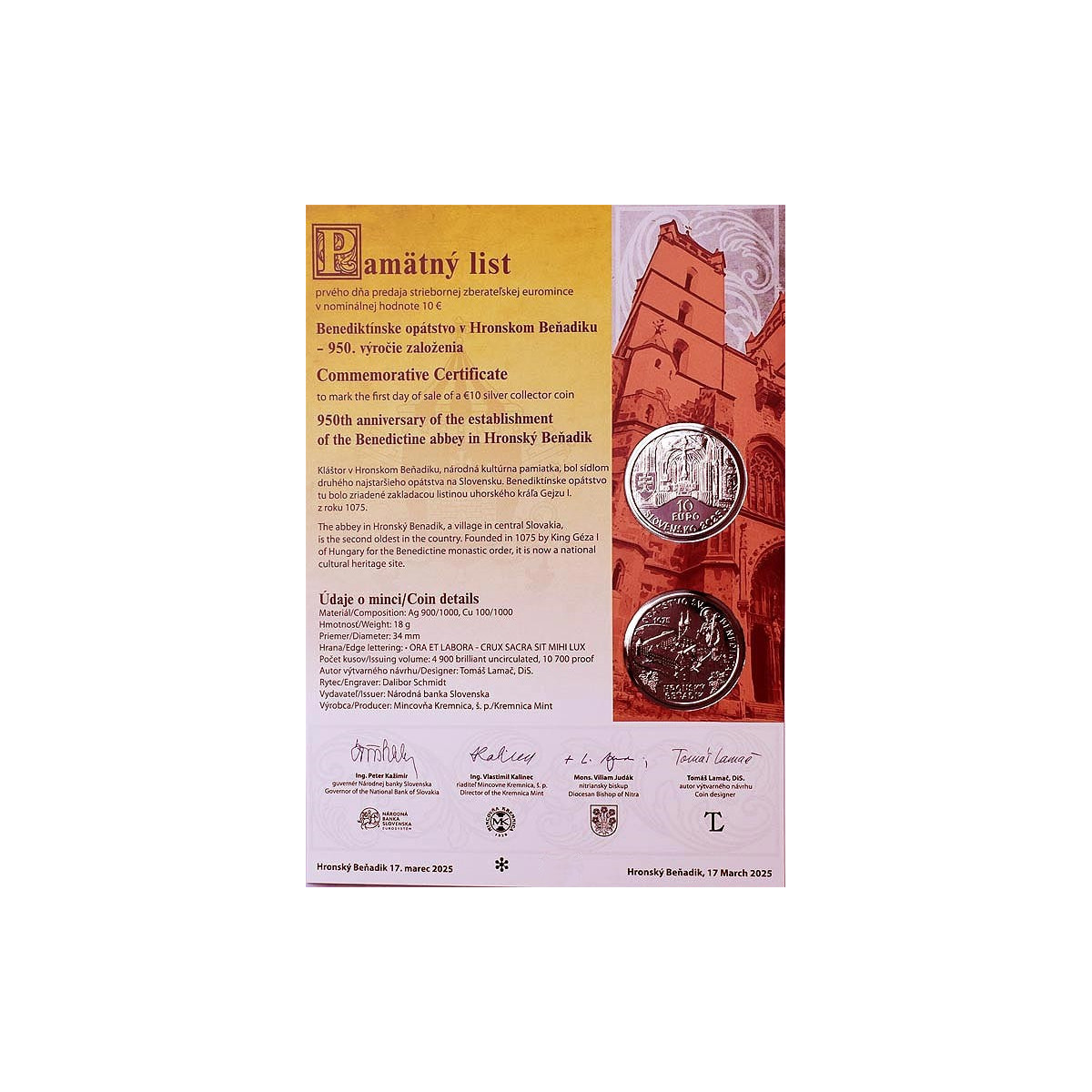 Commemorative sheet of the first day of sale of the silver collector 10 Euro coin issued in 2025 on the occasion of the 950th anniversary of the founding of the Benedictine abbey in Hronský Beňadik. Edition of the commemorative sheet: 2000 pcs