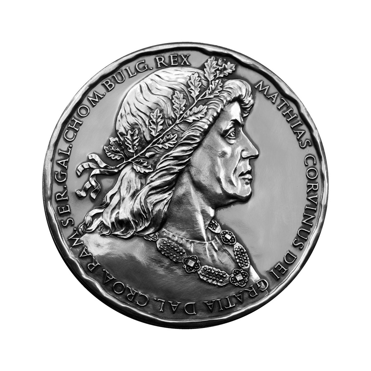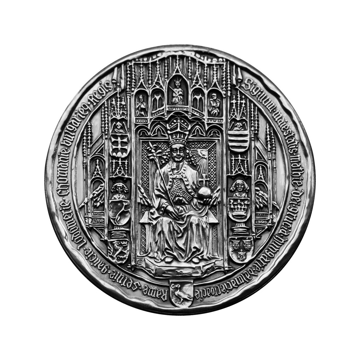 Silver medal depicting the historic Great Seal of Matthew Corvinus and his period portrait made of 999/1000 silver with an old-silver finish.