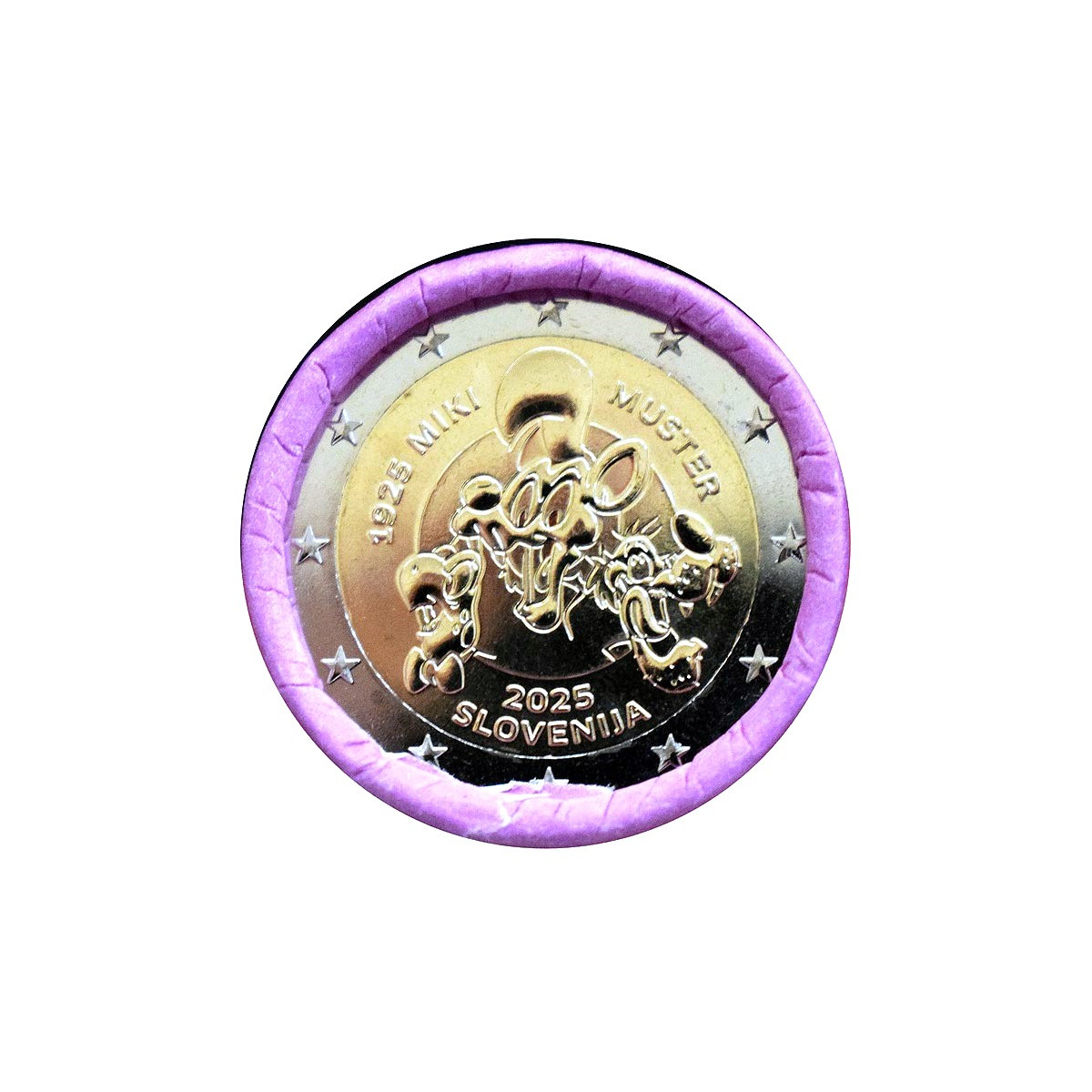 Commemorative 2 Euro coin of Slovenia, issued in 2025. This collector euro coin was issued on the occasion of the 150th anniversary of the birth of the famous Slovenian comic book author Miki Muster.
