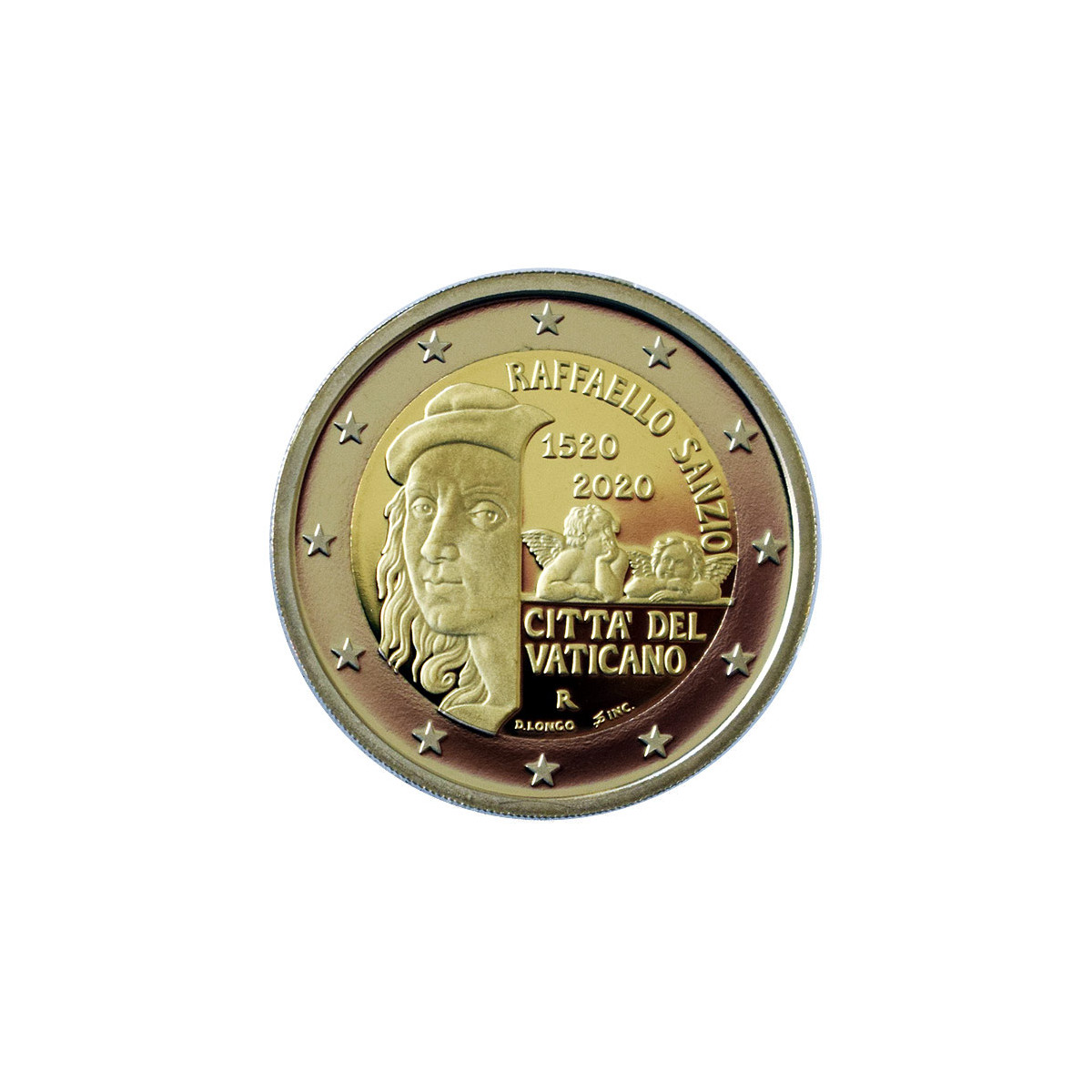 Commemorative 2 Euro Vatican coin, issued in 2020. This collectible euro coin was issued on the occasion of the 500th anniversary of the death of Raffaello Santi, an Italian Renaissance painter.
