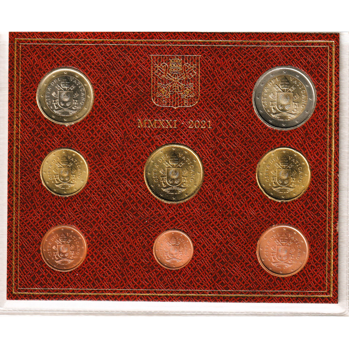 A collector's set of circulating EURO coins issued by the Vatican in 2021 during the pontificate of Pope Francis, featuring the motif of his coat of arms.