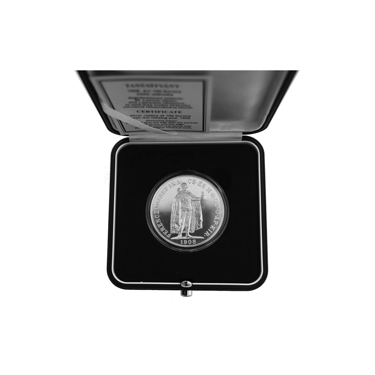 Strieborný odrazok pôvodnej 100 koruny František Jozef I. z roku 1908 vyhotovený Maďarskou mincovňou s použitím historických originálnych razidiel z roku 1908 (bez zmeny v letopočte). Označenie KB, BP.