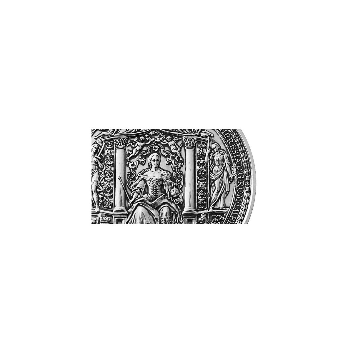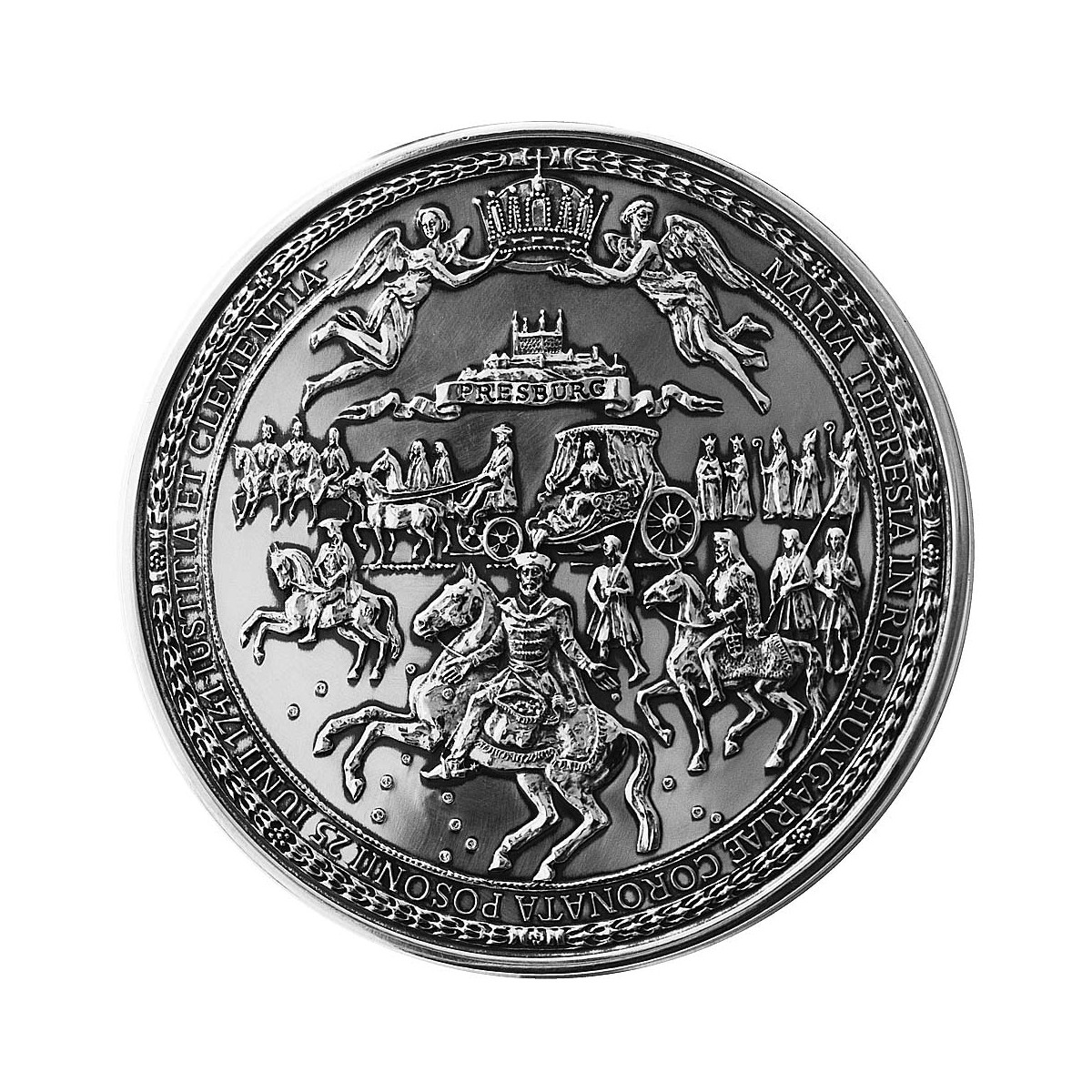 Výnimočná strieborná medaila zobrazujúca historickú Veľkú pečať Márie Terézie a korunovačný sprievod vyhotovená z 999/1000 striebra s povrchovou úpravou staré-striebro.