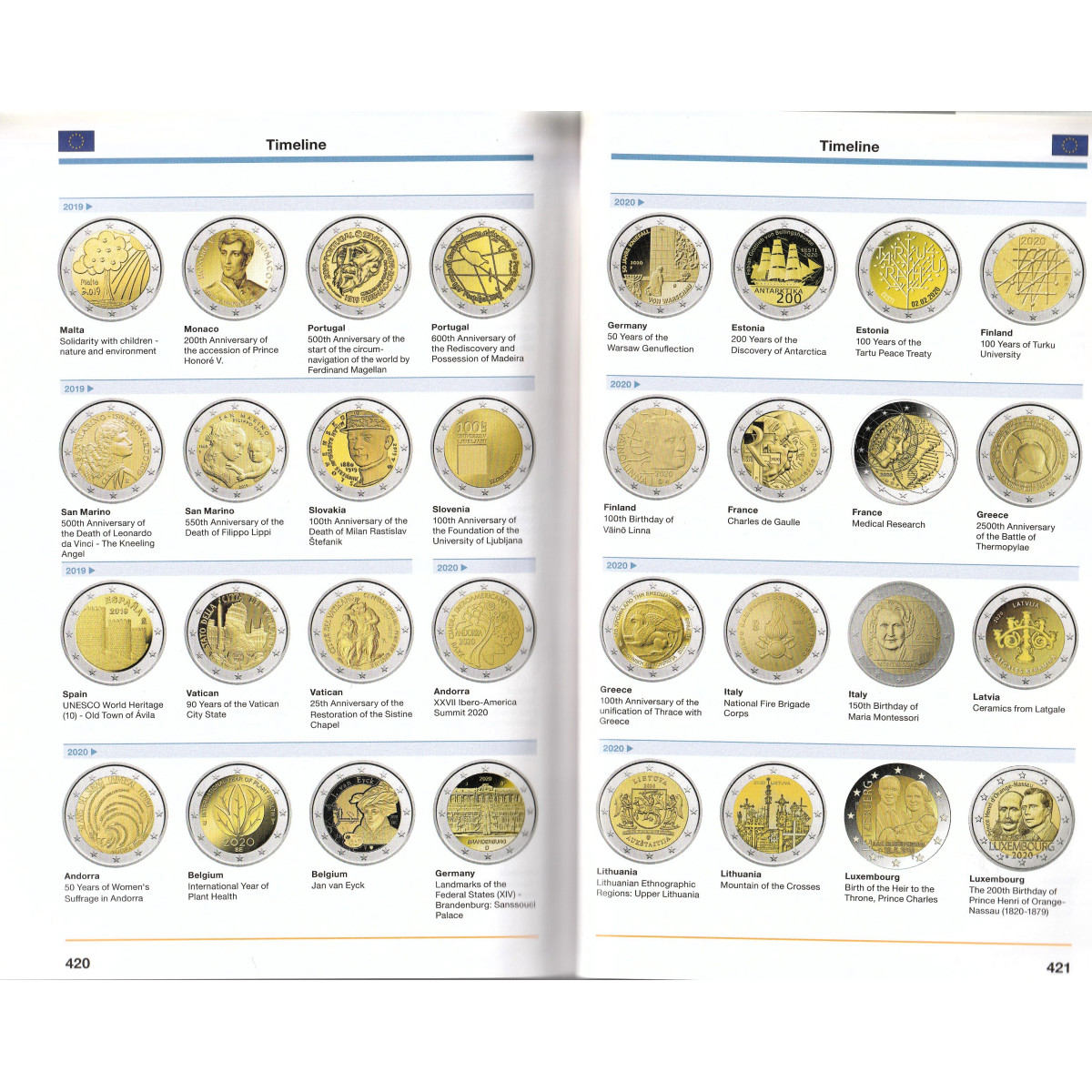 V druhej polovici katalógu je prehľadne graficky spracovaný časový sled vydávania pamätných 2 euro mincí až do roku 2025.