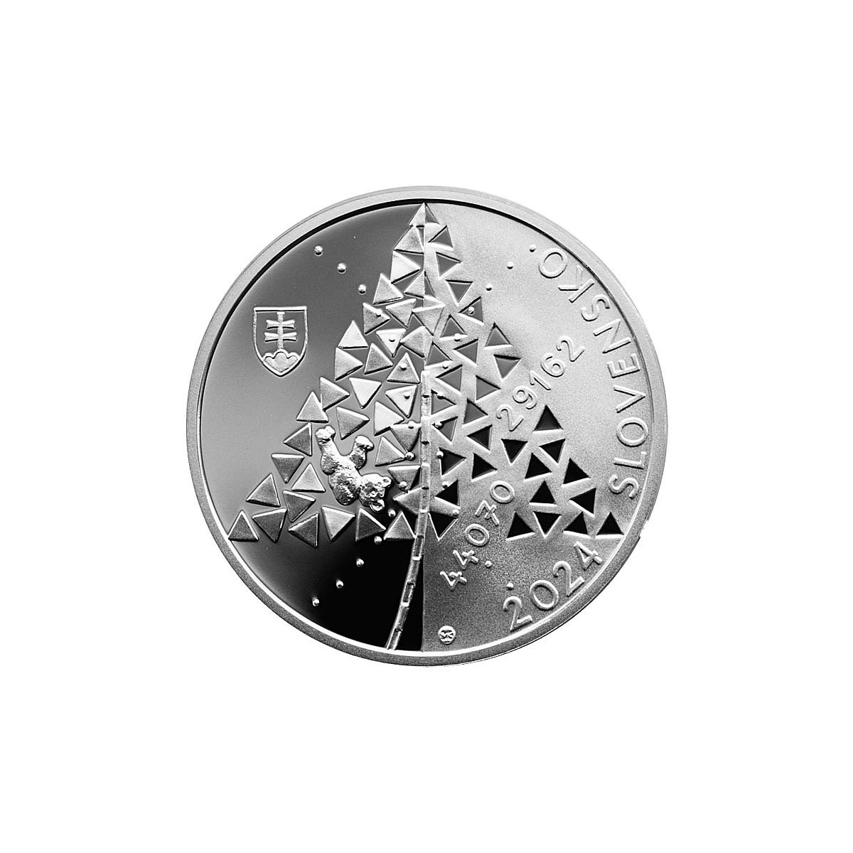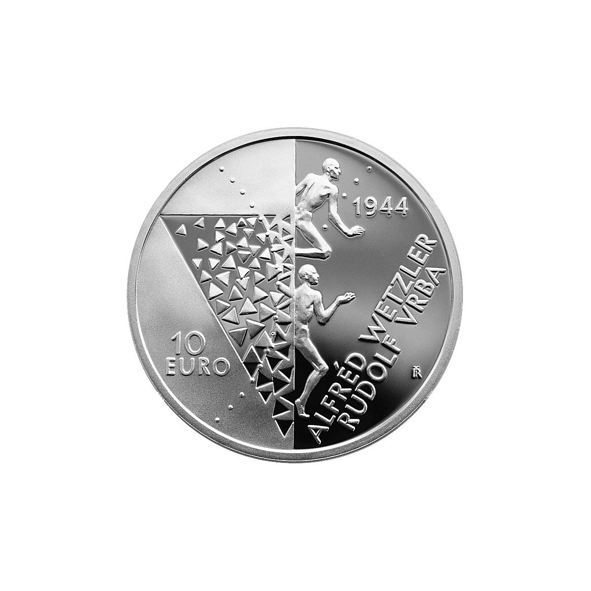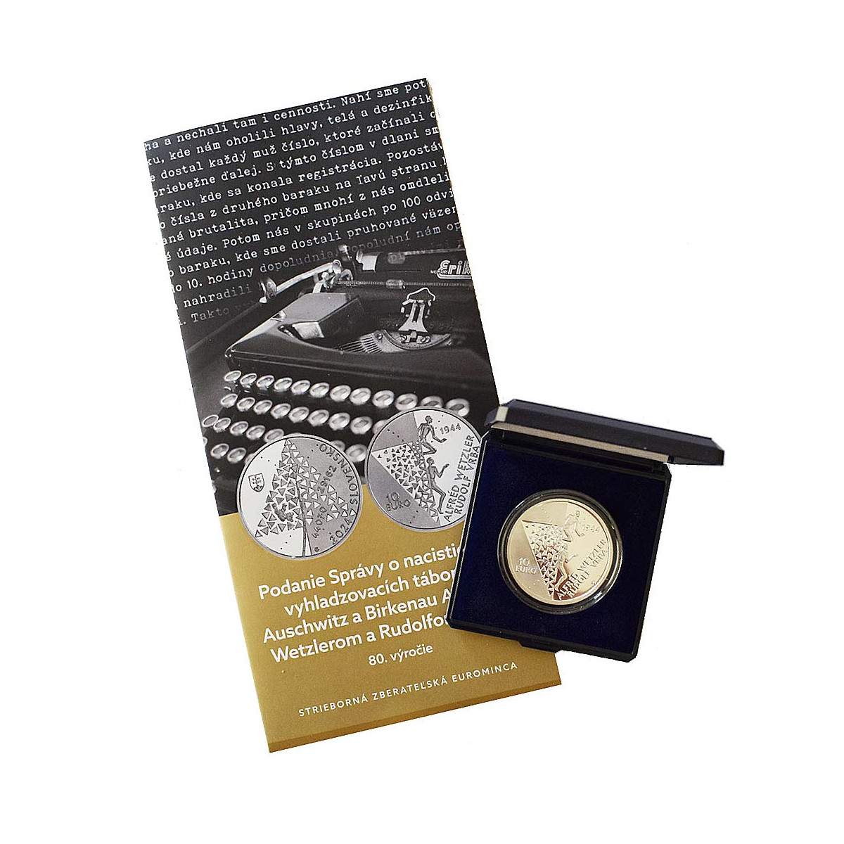 Strieborná zberateľská eurominca Slovenska r. 2024 s nominálnou hodnotou 10 EURO vydaná pri príležitosti 80. výročia poskytnutia správy o vyhladzovacích nacistických táboroch v komplexe Auschwitz-Birkenau (Osvienčimský tábor) slovákmi Alfrédom Wetzlerom a Rudolfom Vrbom v proof vyhotovení.