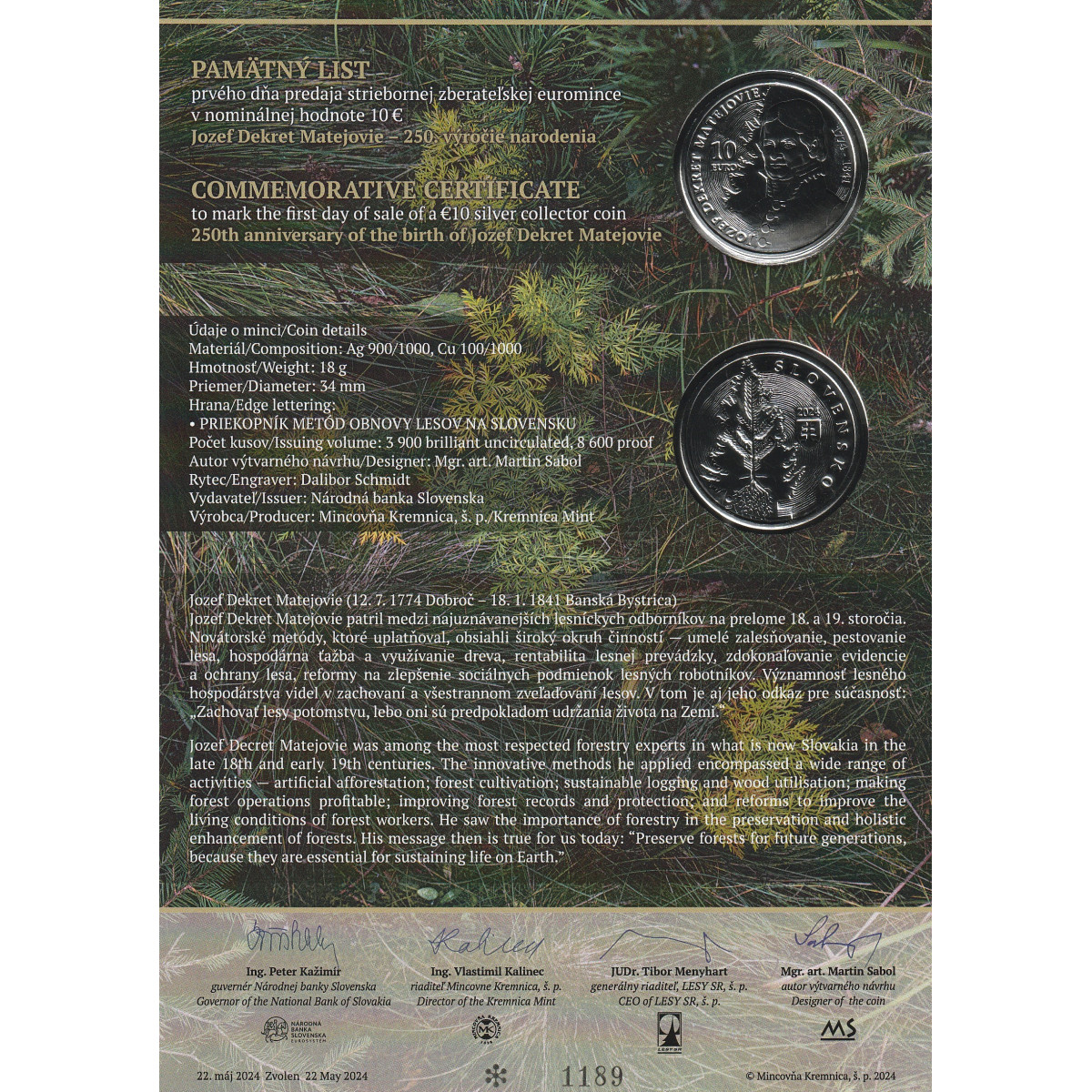 Pamätný list prvého dňa predaja striebornej zberateľskej 10 Euro mince vydanej v roku 2024 pri príležitosti 250. výročia narodenia slovenského lesníka Jozefa Dekreta Matejovie.