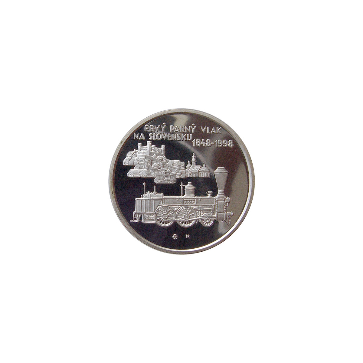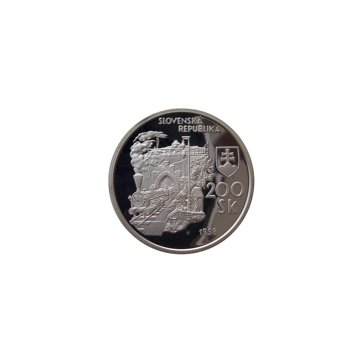 Pamätná strieborná minca Slovenska r. 1998 v nominálnej hodnote 200 Sk vydaná pri príležitosti 150. výročia príchodu prvého parného vlaku na Slovensko, v prevedení proof kvalita.