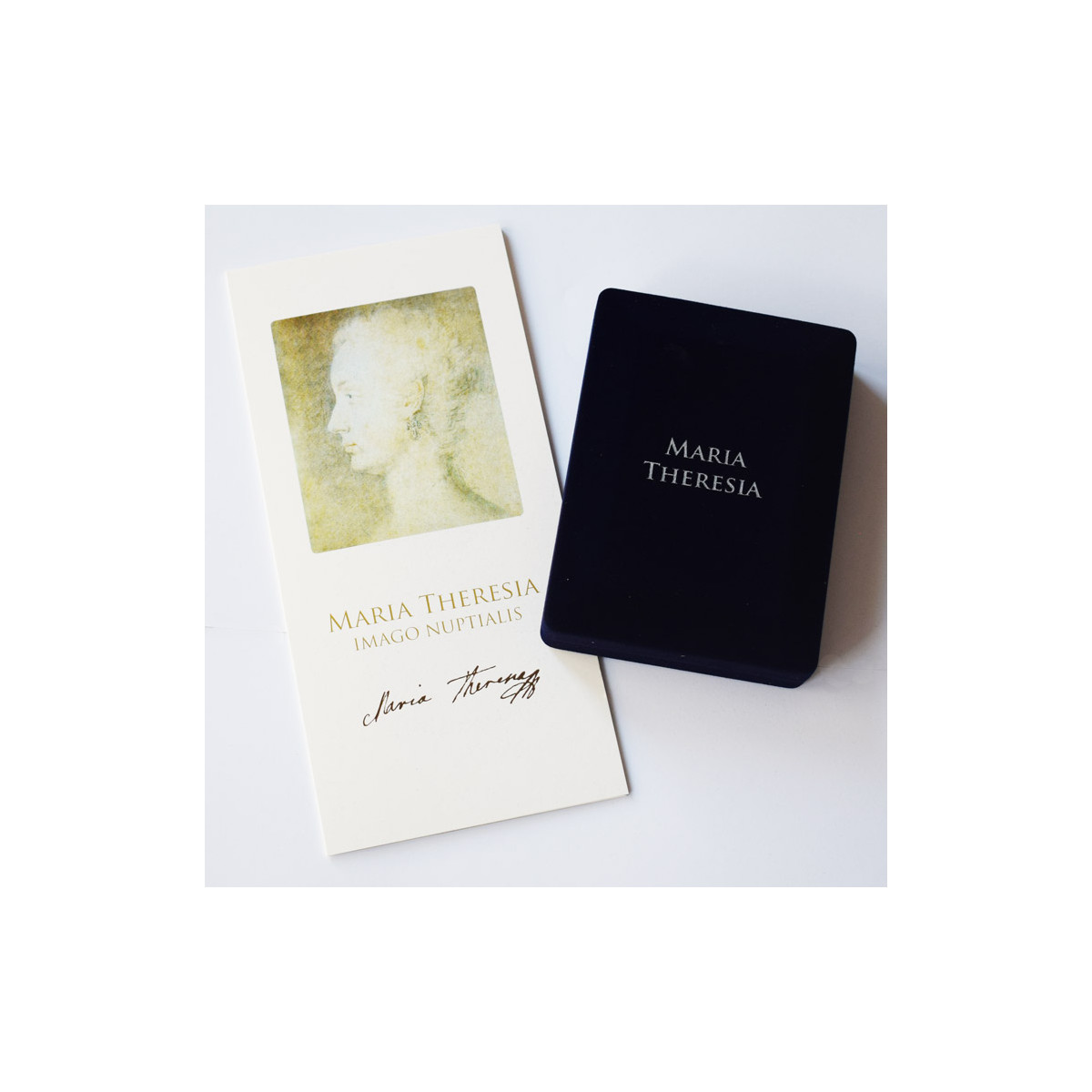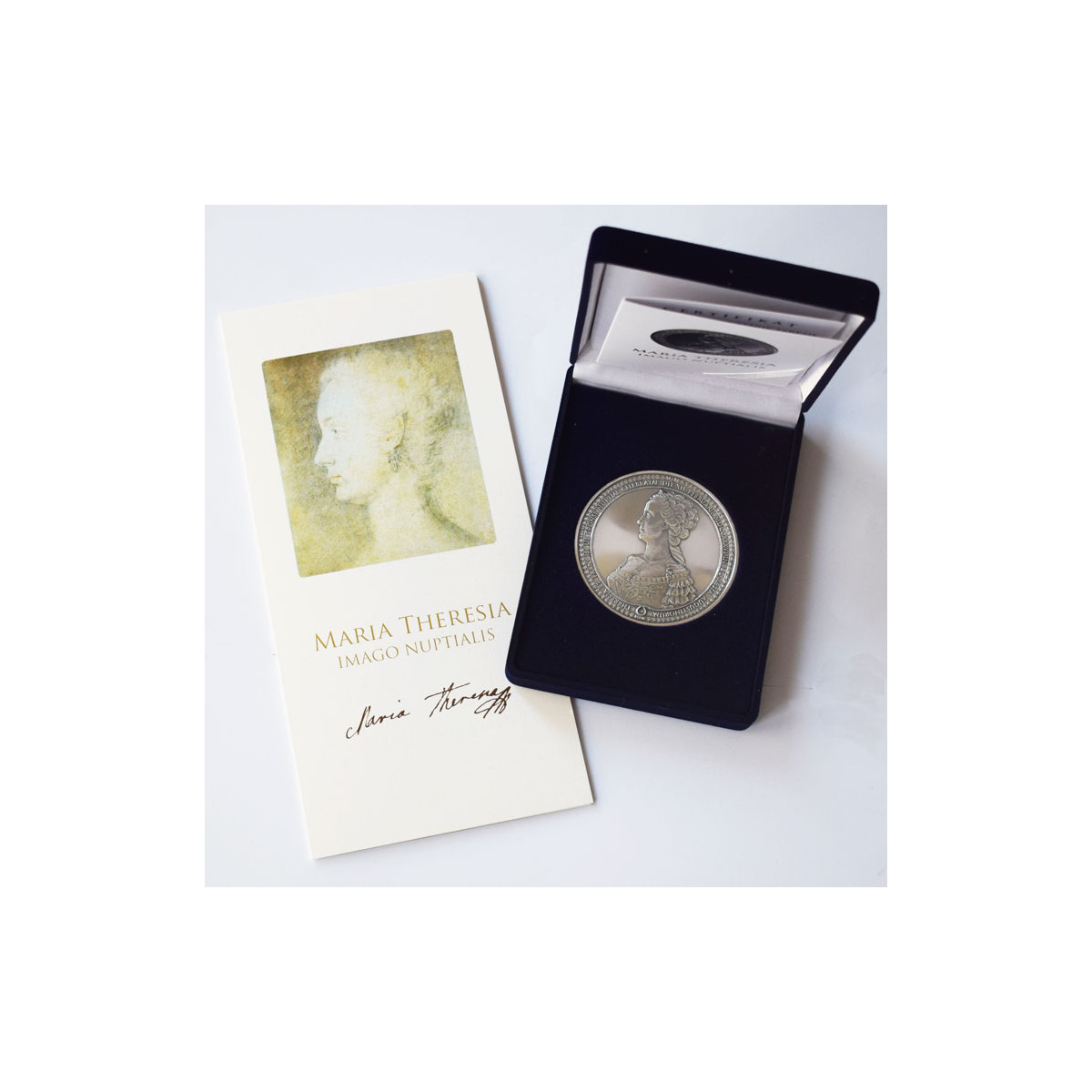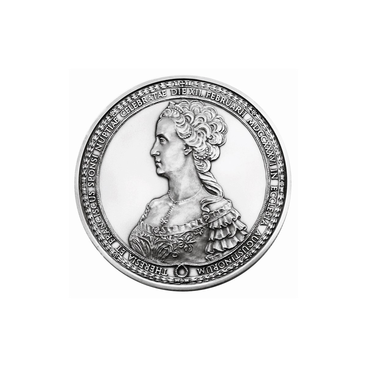 Strieborná medaila zobrazujúca panovníčku Máriu Teréziu ako nevestu v deň svadby s Františkom I. o rýdzosti 999/1000 striebra a váhe 62g inšpirovaná pôvodnou skicou.