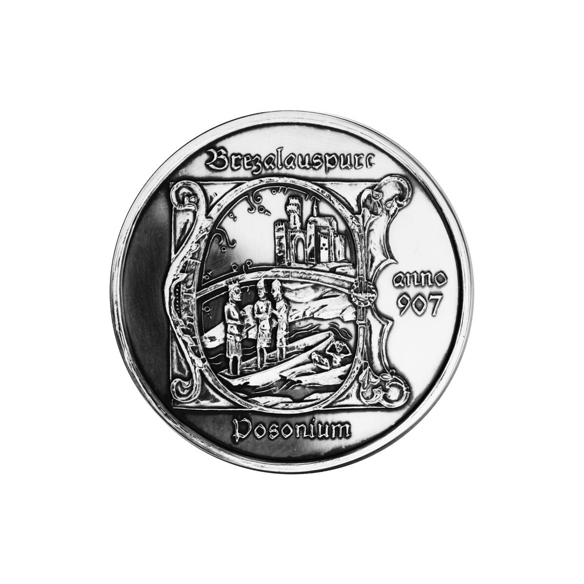 Strieborná medaila s motívom Bratislavy v prevedení patina starostriebro o rýdzosti Ag 999/1000.