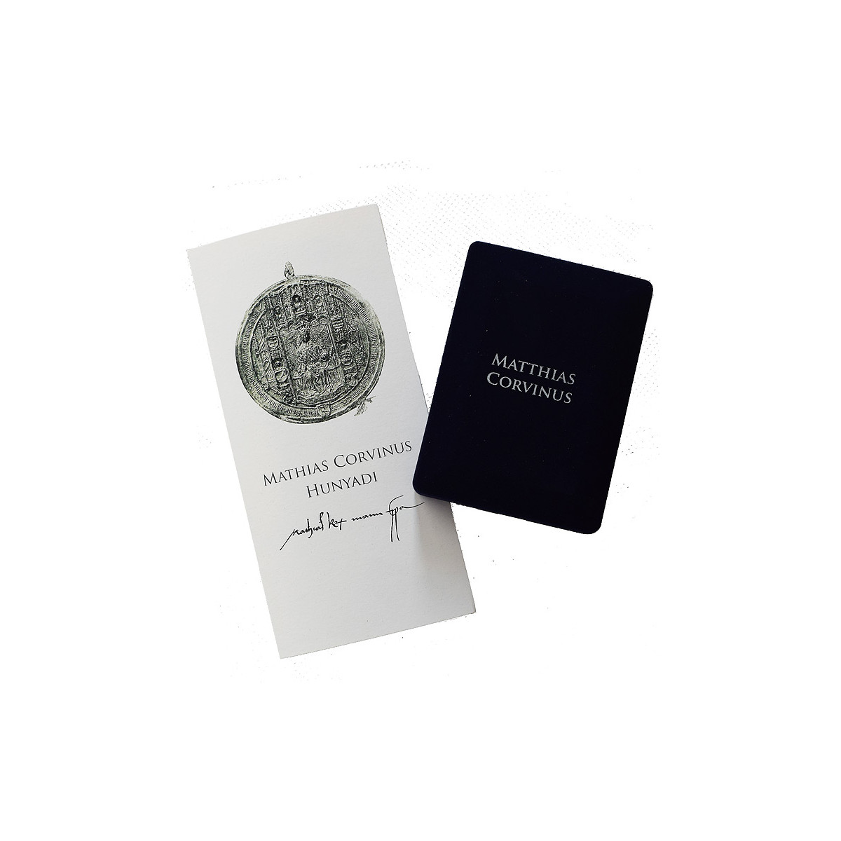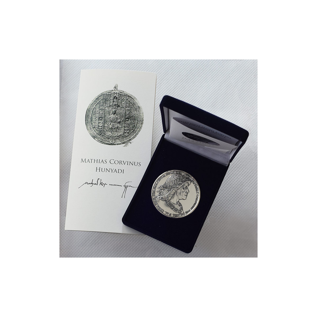 Strieborná medaila zobrazujúca historickú Veľkú pečať Mateja Korvína a jeho dobový portrét vyhotovená z 999/1000 striebra s povrchovou úpravou staré-striebro.