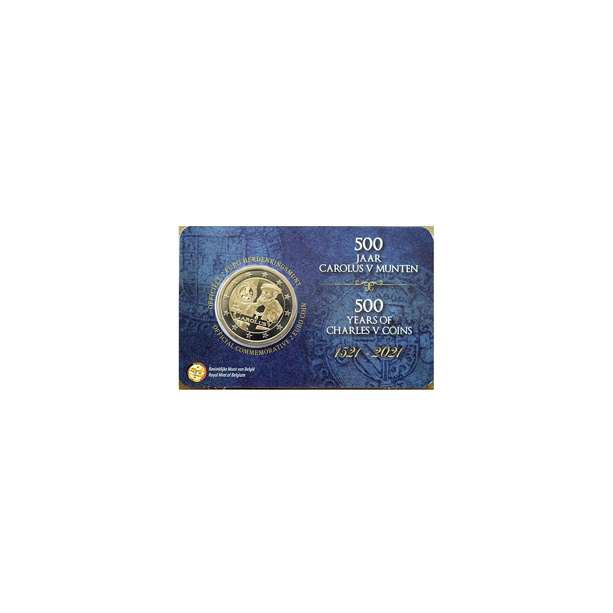Pamätná 2 Euro minca Belgicka, emitovaná v roku 2021. Táto zberateľská eurominca bola vydaná pri príležitosti 500. výročia mincí razených za panovania Karola V.