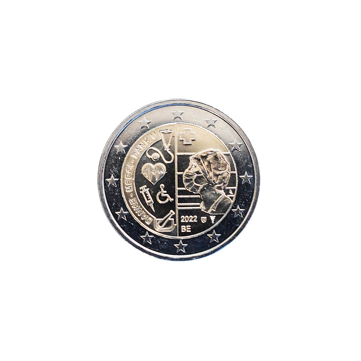 Pamätná 2 Euro minca Belgicka, emitovaná v roku 2022. Táto zberateľská eurominca je venovaná zdravotníckemu personálu, ktorí bojoval v pandémii Covid-19.