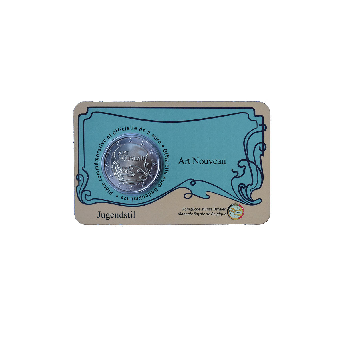 Motívom euromince je detail nástennej mozaiky z fasády domu Eetvelde v Bruseli, ktorú navrhol belgický secesný umelec Victor Horta. Mincová karta, v ktorej je umiestnená 2 Euro minca je ozdobená secesnými znázorneniami kvetinových girland a typickými secesnými farbami inšpirovanými prírodou.