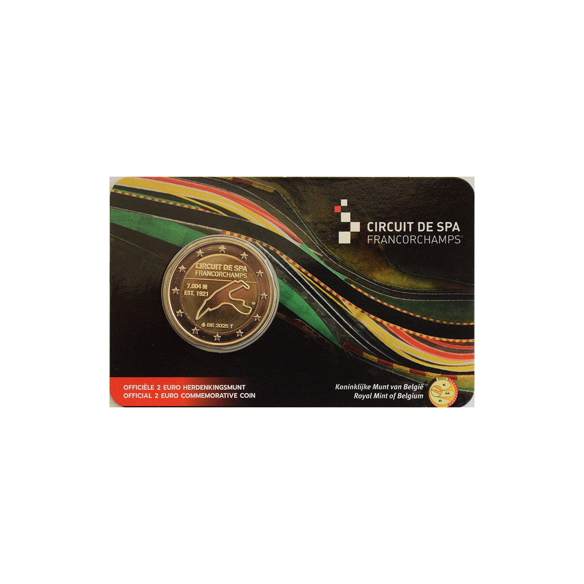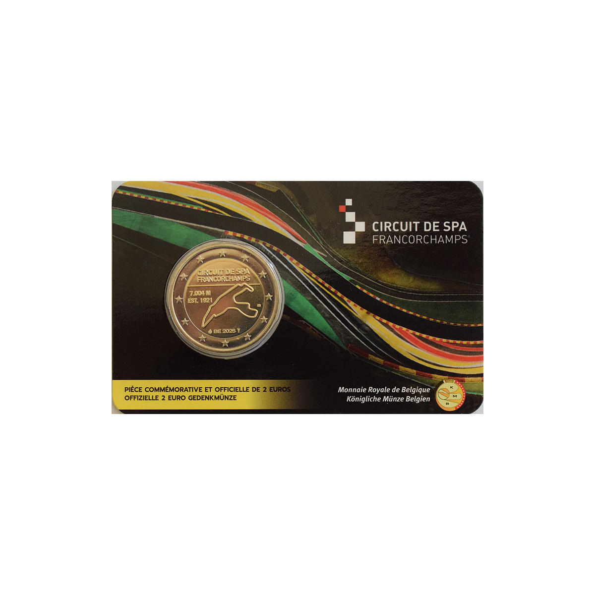 Pamätná 2 Euro minca Belgicka, emitovaná v roku 2025. Táto zberateľská eurominca bola vydaná na počesť okruhu Formuly 1 Spa-Francorchamps.
