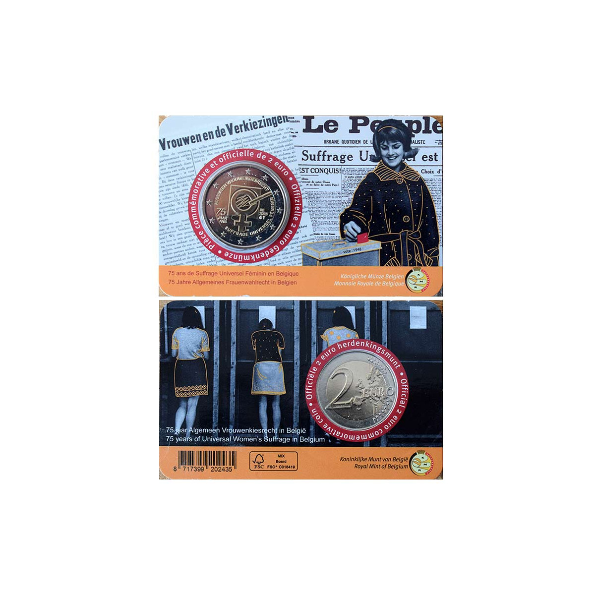 Na mincovej karte je zobrazená radosť z novonadobudnutého volebného práva oznámeného v dennej tlači pred 75 rokmi. Na rube je vidieť, ako niektoré mladé dámy dychtivo využívajú svoje volebné právo.