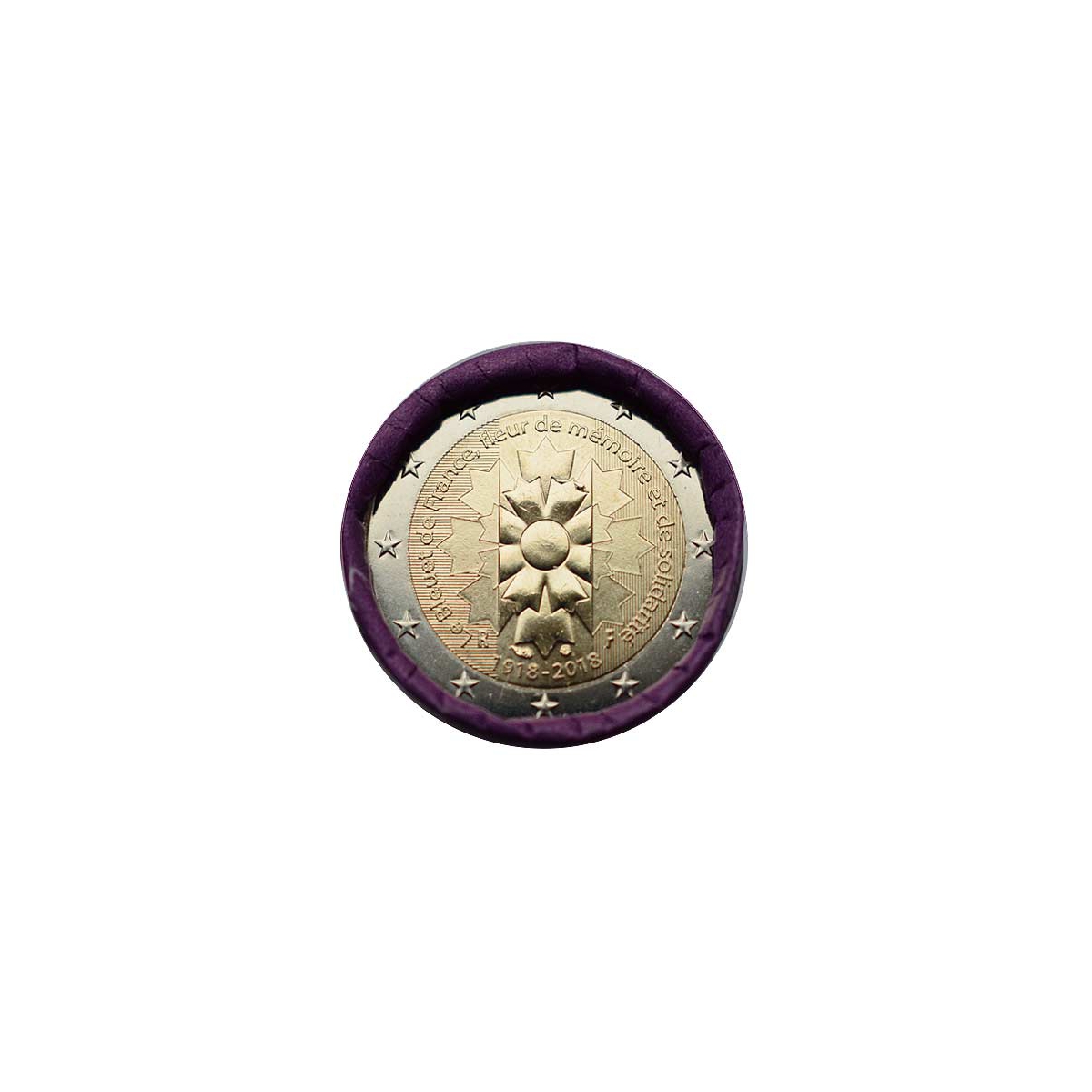 Motívom euromince je vyobrazenie kvetu francúzskej Nevädzy poľnej, ktorá je dodnes symbolom morálnej a finančnej podpory vojnovým veteránom, ako aj obetiam minulých a prebiehajúcich vojen, obetiam terorizmu. Je prostriedkom prejavenia úcty voči všetkým, ktorí bojovali a stále bojujú za slobodu.