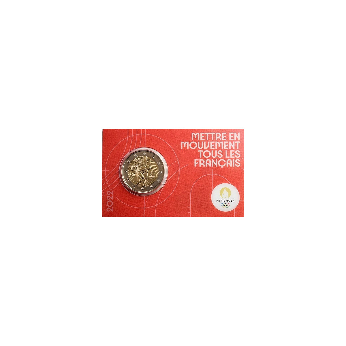 Pamätná 2 Euro minca Francúzska, emitovaná v roku 2022. Táto zberateľská eurominca bola vydaná pri príležitosti konania letných olympijských hier vo Francúzsku v roku 2024.