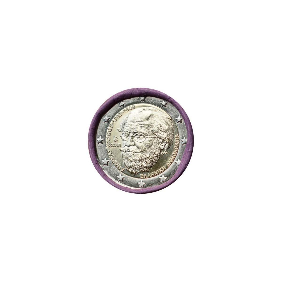 Pamätná 2 Euro minca Grécka, emitovaná v roku 2019. Táto zberateľská eurominca bola vydaná pri príležitosti 150. výročia úmrtia romantického básnika Andreasa Kalovsa.