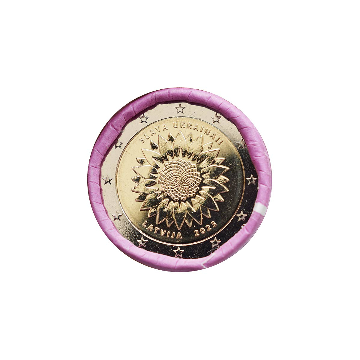 Pamätná 2 Euro minca Lotyšska, emitovaná v roku 2023. Táto zberateľská eurominca bola vydaná s motívom slnečnica pre Ukrajinu.