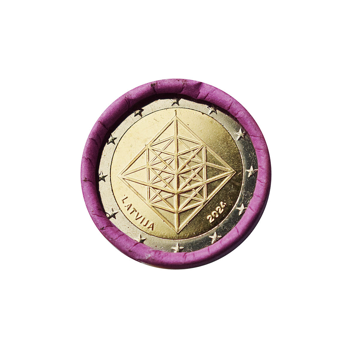 Pamätná 2 Euro minca Lotyšska, emitovaná v roku 2024. Táto zberateľská eurominca bola vydaná s motívom Puzuris - lotyšská ozdoba zimného slnovratu, symbolizujúca harmóniu a snahu o rovnováhu.