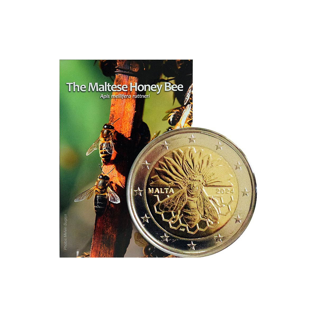 Pamätná 2 Euro minca Malty, emitovaná v roku 2024. Táto zberateľská eurominca bola vydaná s názvom "Maltská Včela medonosná" ako pripomienka dôležitosti včiel pri opeľovaní, ktoré je kľúčové pre globálnu produkciu potravín.