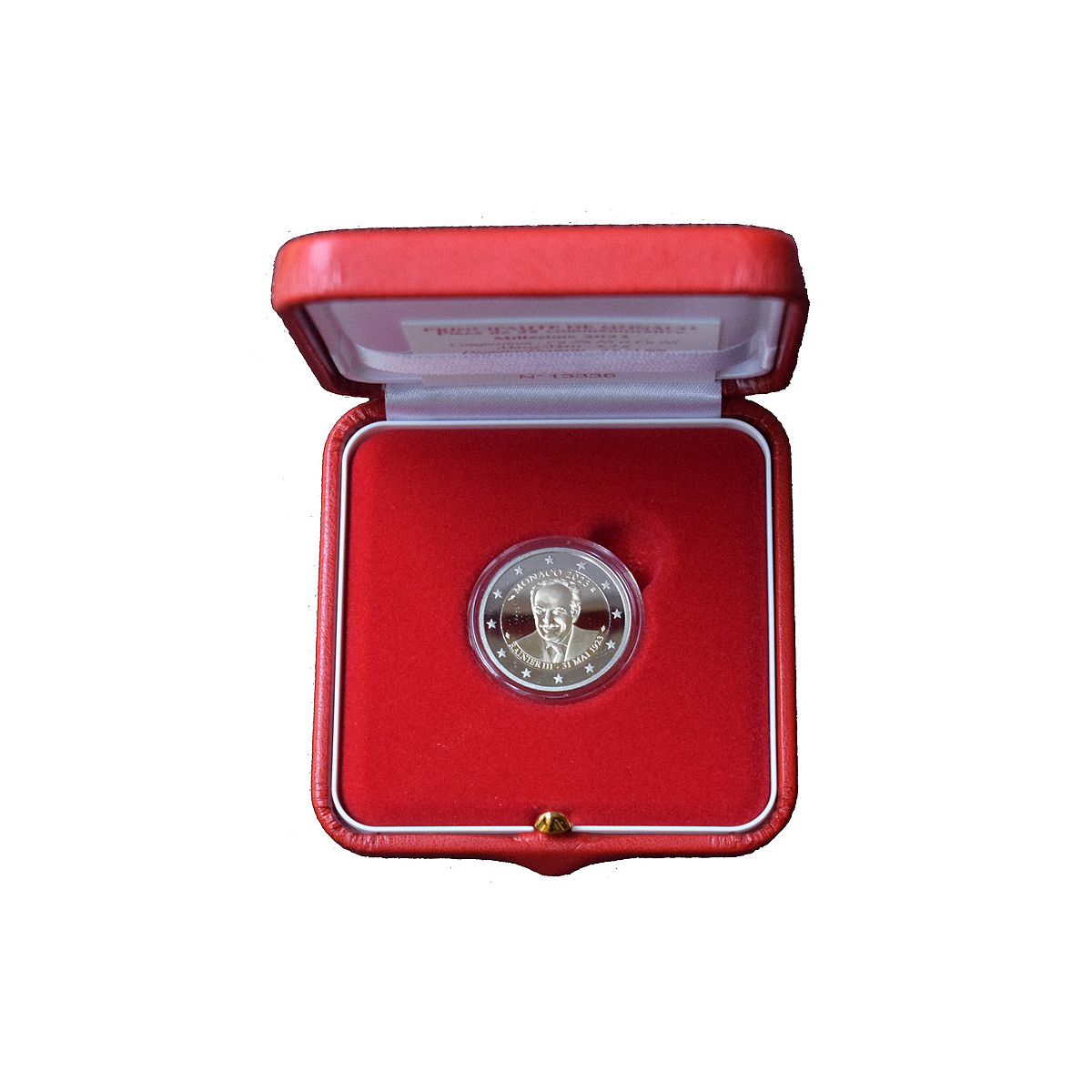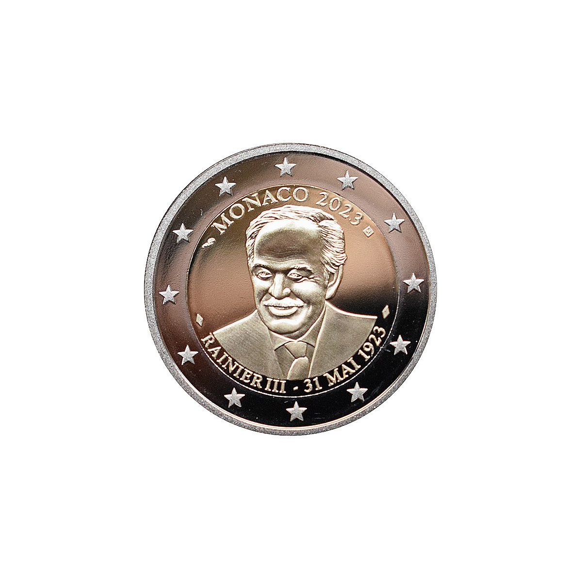 Pamätná 2 Euro minca Monaka, emitovaná v roku 2023. Táto zberateľská eurominca bola vydaná pri príležitosti 100. výročia narodenia monackého kniežaťa Rainiera III.