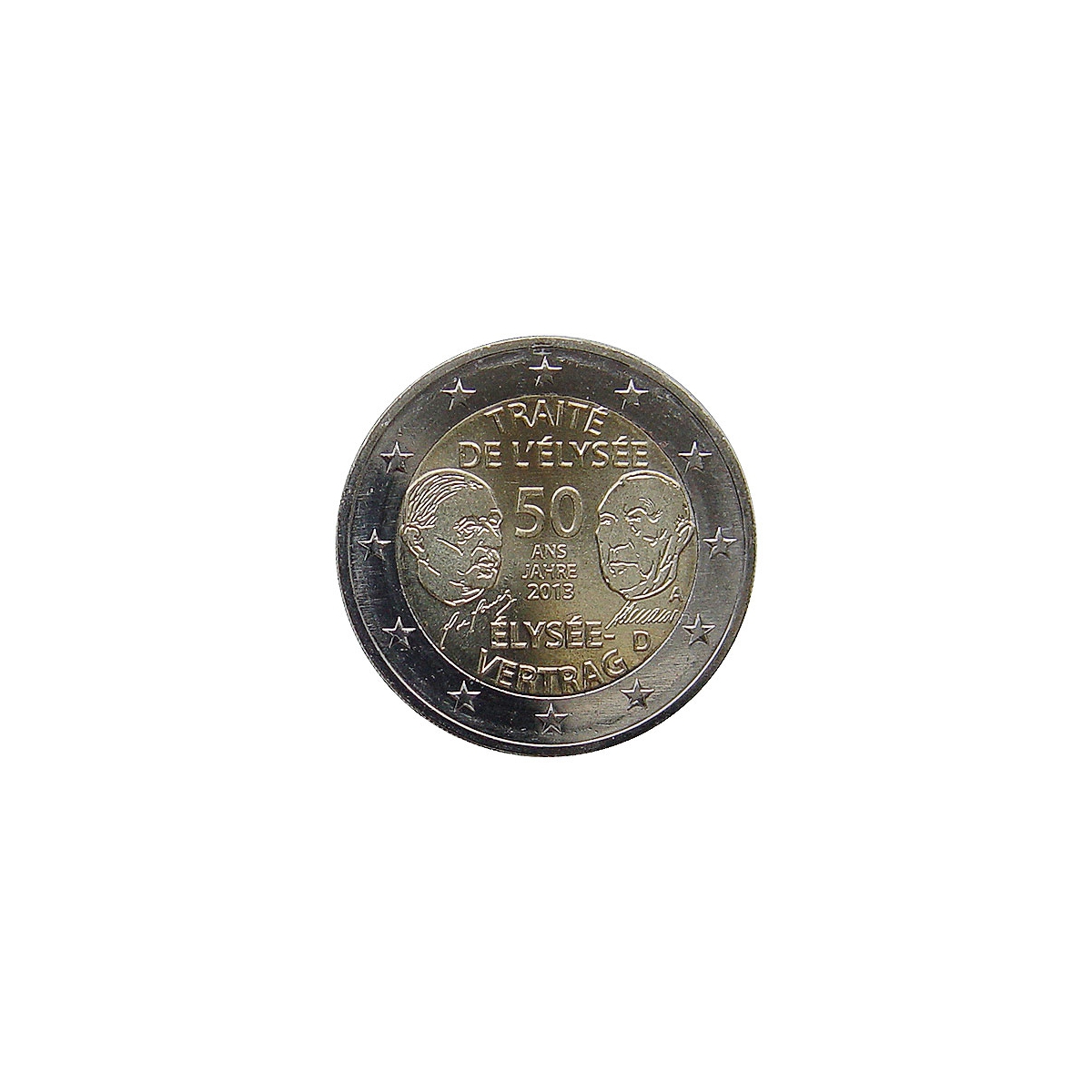 Pamätná 2 Euro minca Nemecka (A), emitovaná v roku 2013. Táto zberateľská eurominca bola vydaná pri príležitosti 50. výročia podpísania Elyzejskej zmluvy.