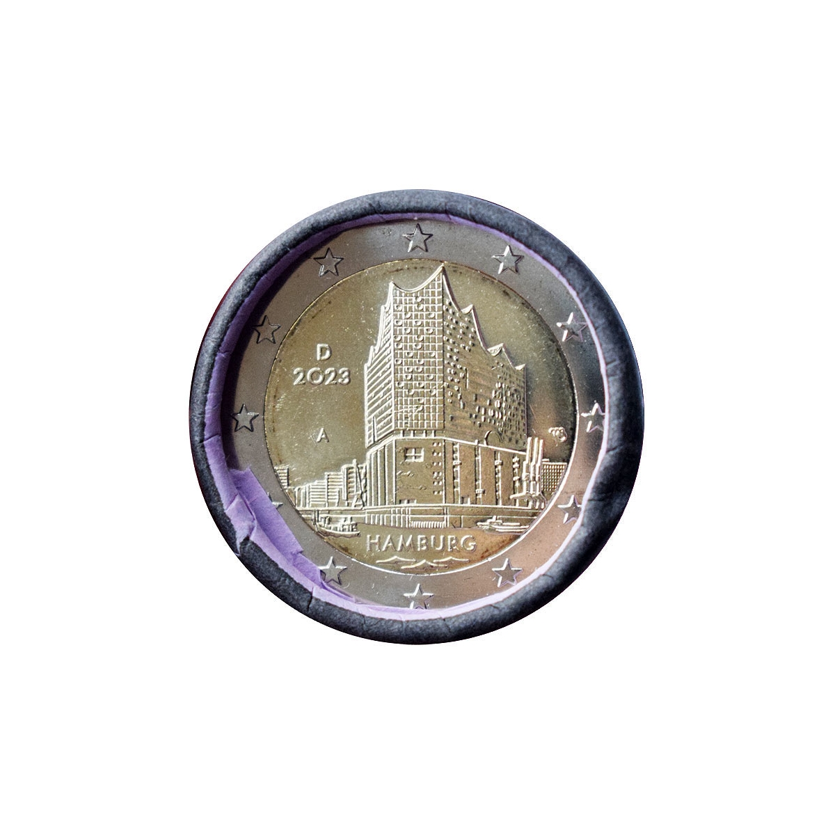 Pamätná 2 Euro minca Nemecka (A), emitovaná v roku 2023. Táto zberateľská eurominca bola vydaná s motívom Hamburg.