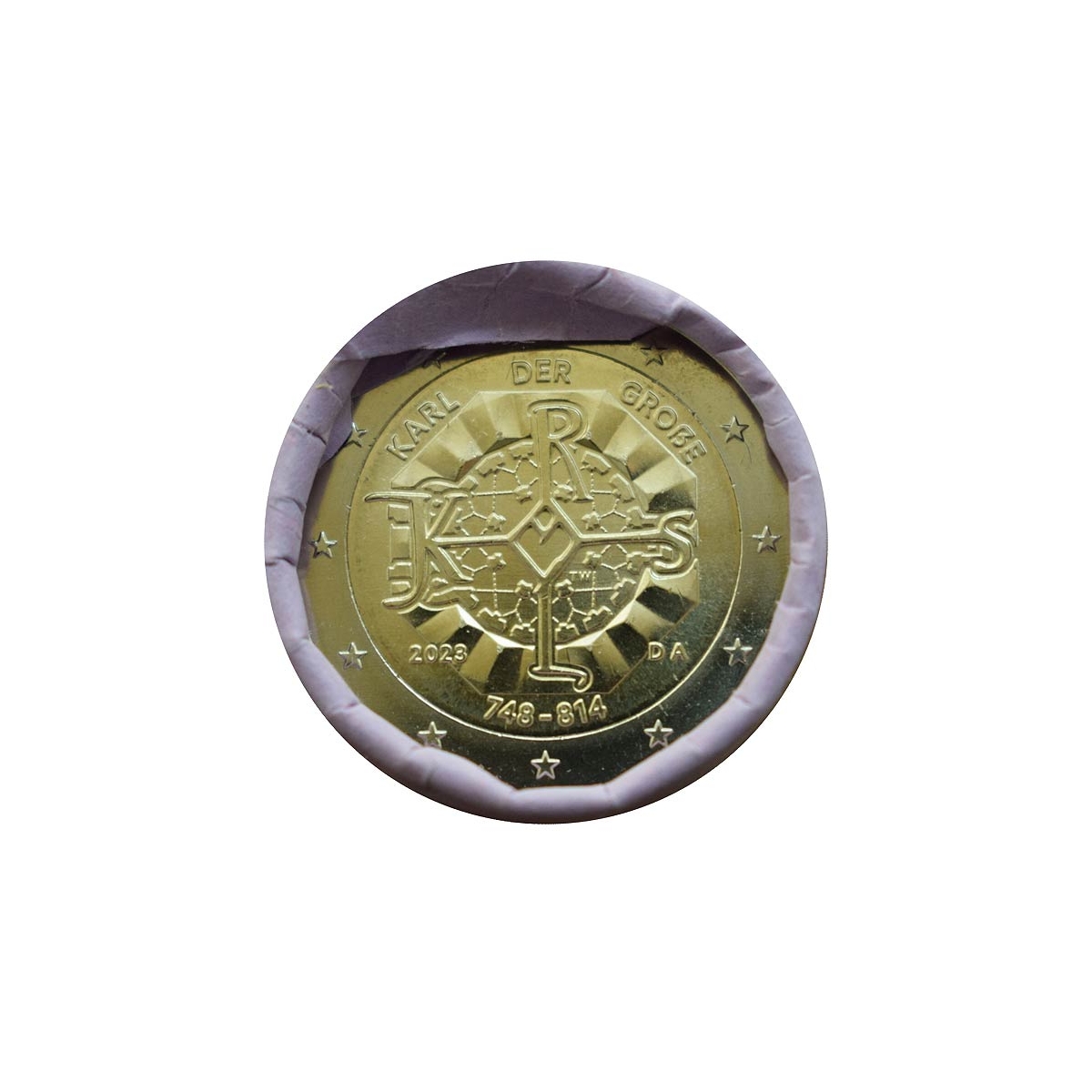 Pamätná 2 Euro minca Nemecka (A), emitovaná v roku 2023. Táto zberateľská eurominca bola vydaná pri príležitosti 1275. výročia narodenia Karola Veľkého.