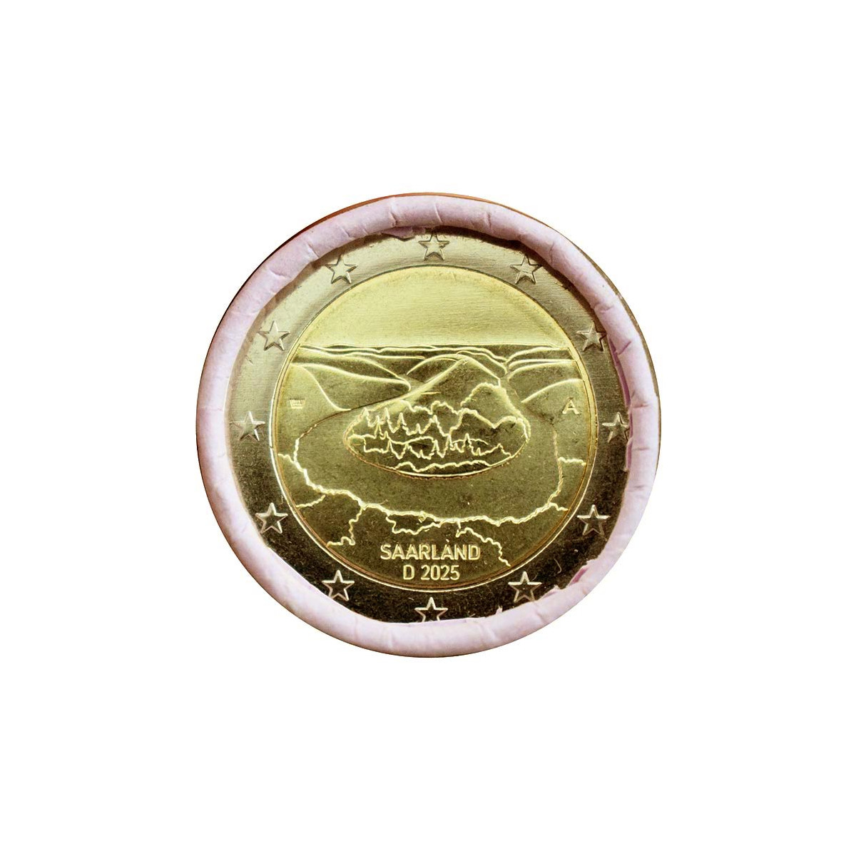 Pamätná 2 Euro minca Nemecka razená v mincovni Berlín (A), emitovaná v roku 2025. Táto zberateľská eurominca bola vydaná ako ďalšia novej série spolkových krajín - Sársko (Saarland).