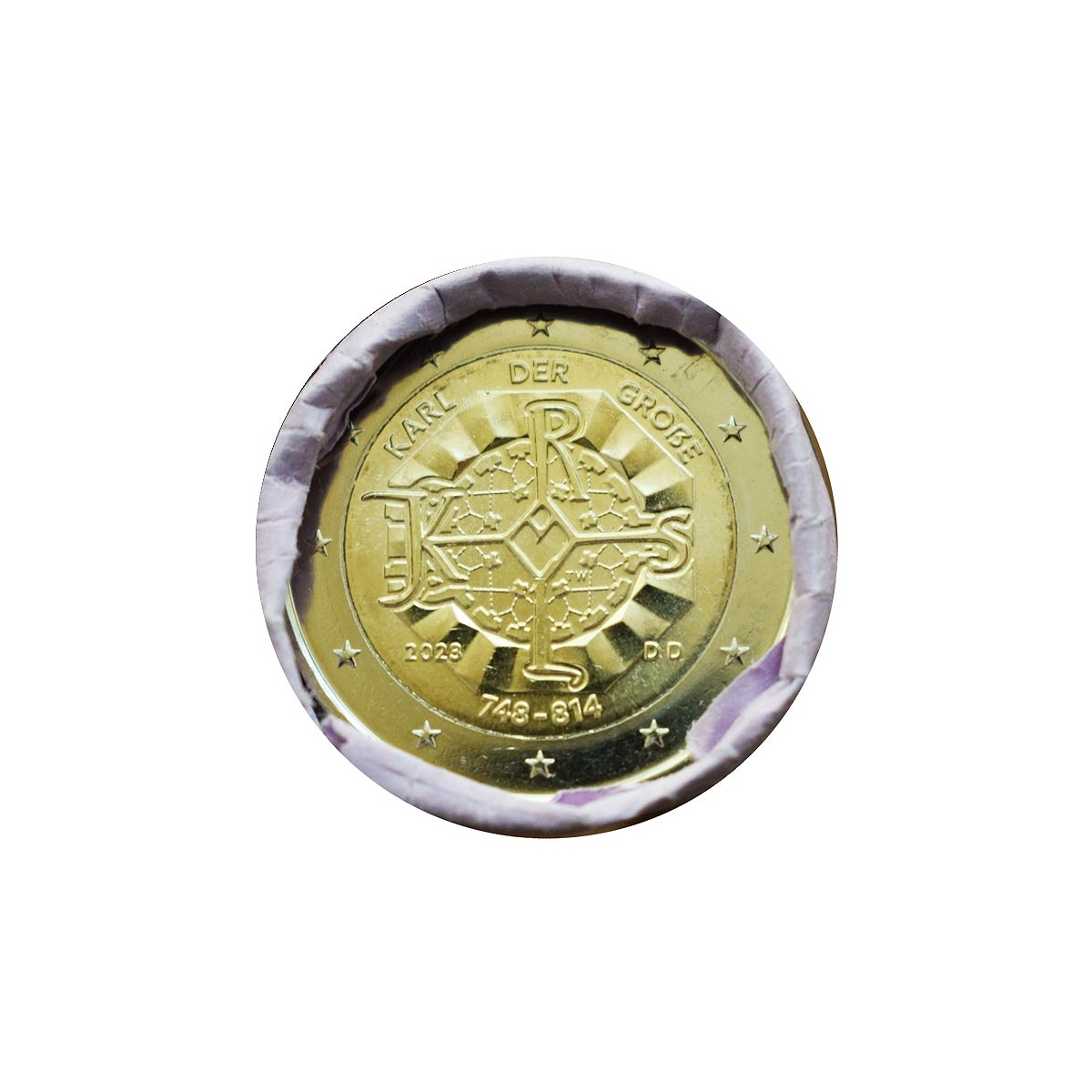 Pamätná 2 Euro minca Nemecka (D), emitovaná v roku 2023. Táto zberateľská eurominca bola vydaná pri príležitosti 1275. výročia narodenia Karola Veľkého.