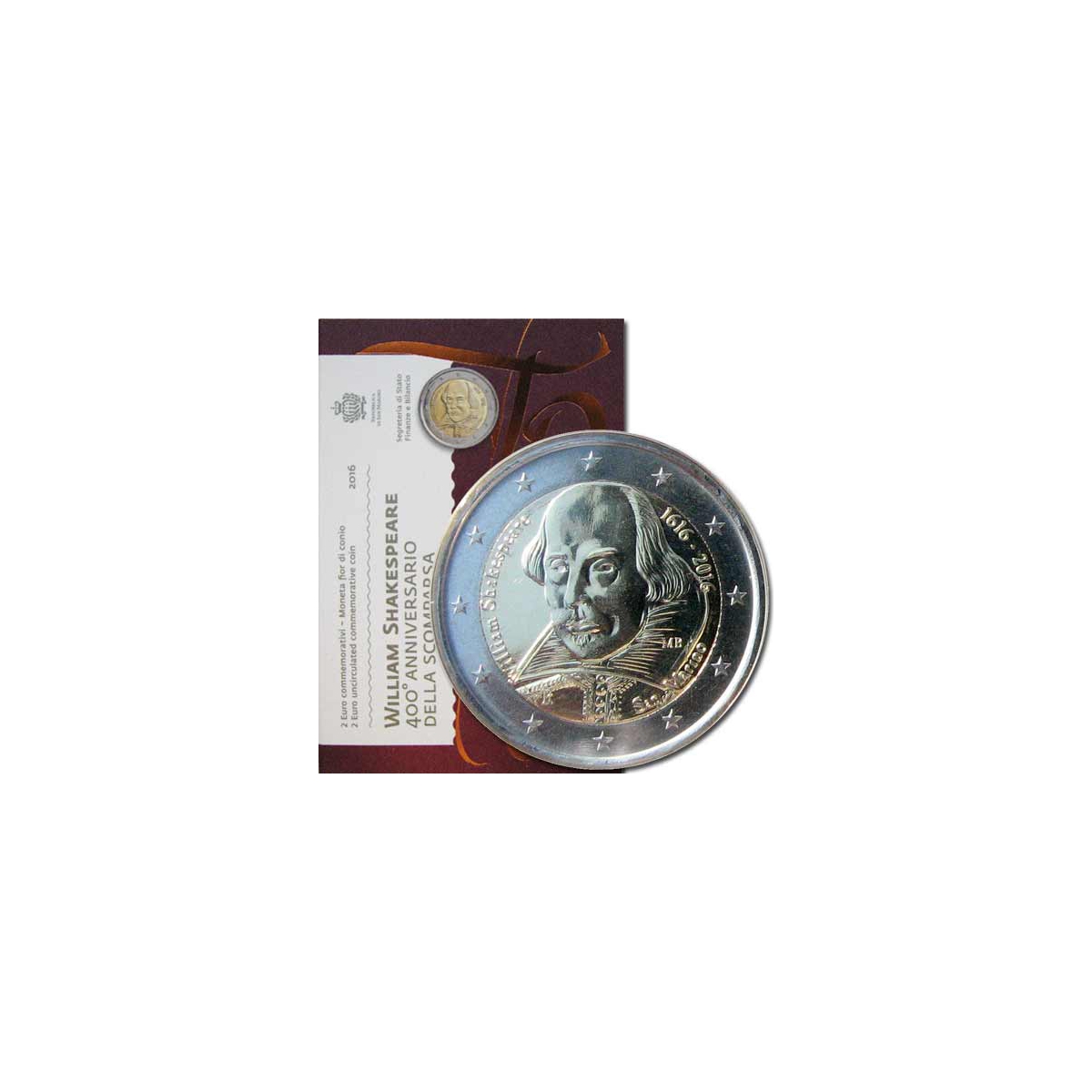 Pamätná 2 Euro minca San Marína, emitovaná v roku 2016. Táto zberateľská eurominca bola vydaná pri príležitosti 400. výročia smrti Williama Shakespeara.