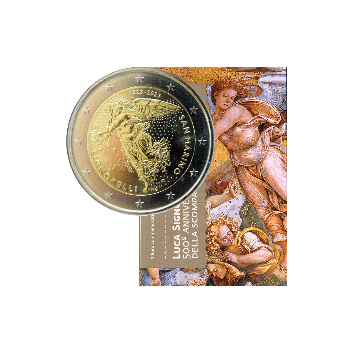 Pamätná 2 Euro minca San Marína, emitovaná v roku 2023. Táto zberateľská eurominca bola vydaná pri príležitosti 500. výročia smrti talianskeho maliara Lucu Signorelliho.
