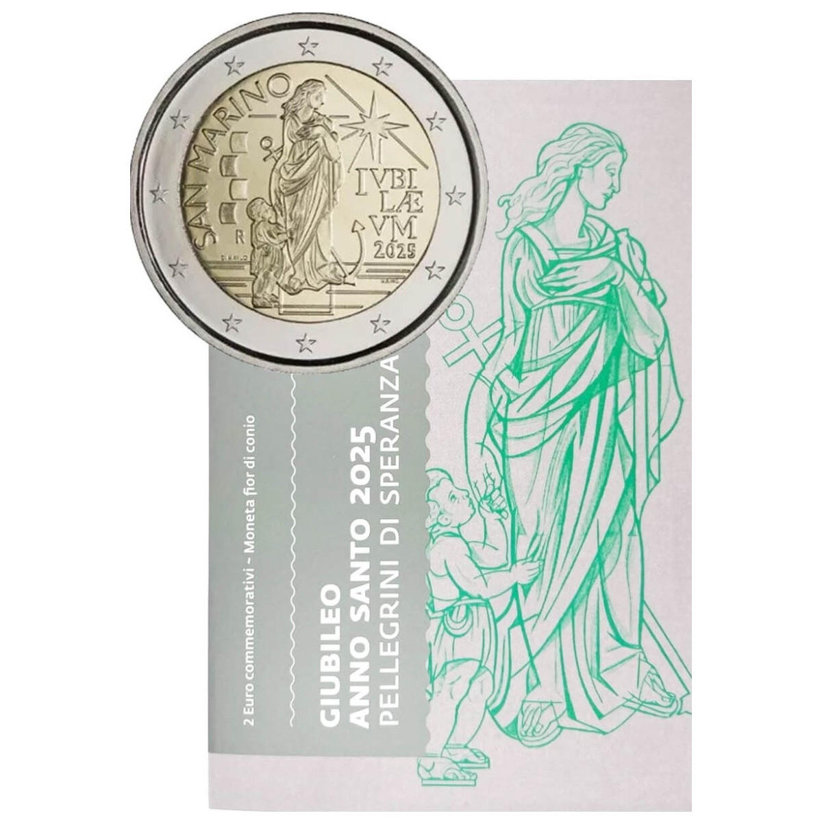 Pamätná 2 Euro minca San Marína, emitovaná v roku 2025. Táto zberateľská eurominca bola vydaná pri príležitosti plynutia Svätého roku 2025 - Jubileum, ktoré vyhlásila Katolícka cirkev.