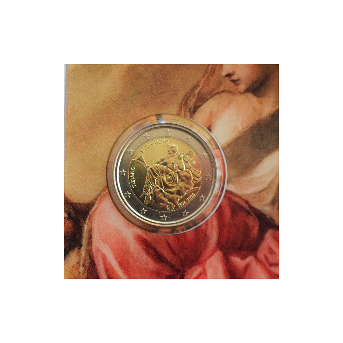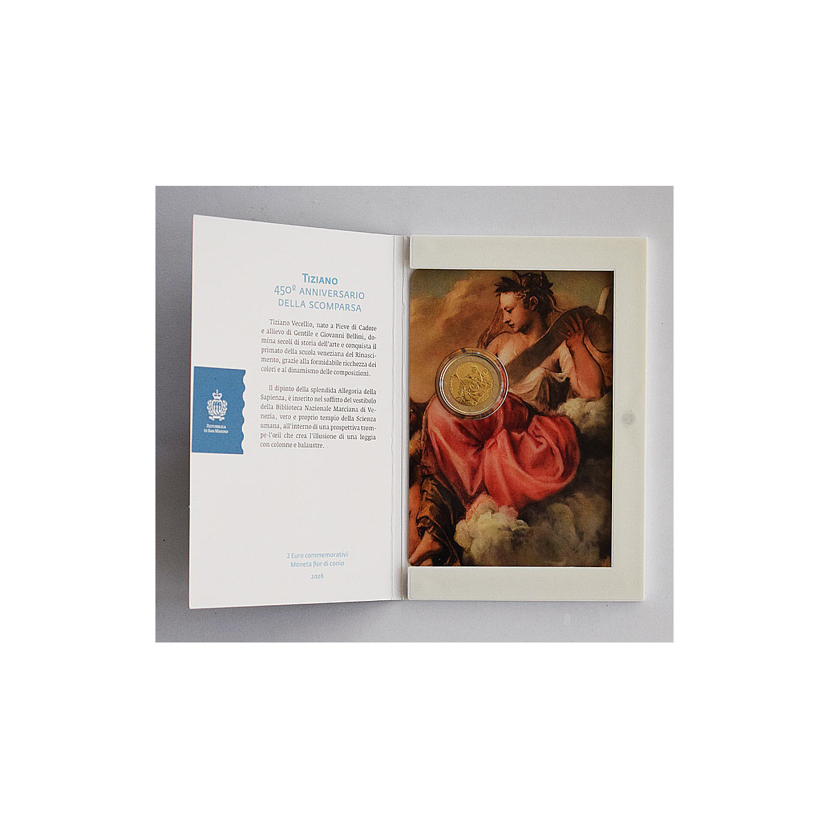 Pamätná 2 Euro minca San Marína, emitovaná v roku 2026. Táto zberateľská eurominca bola vydaná pri príležitosti 450. výročia úmrtia Tiziana Vecelliho, jedného z najvýznamnejších talianskych renesančných maliarov 16-teho storočia.