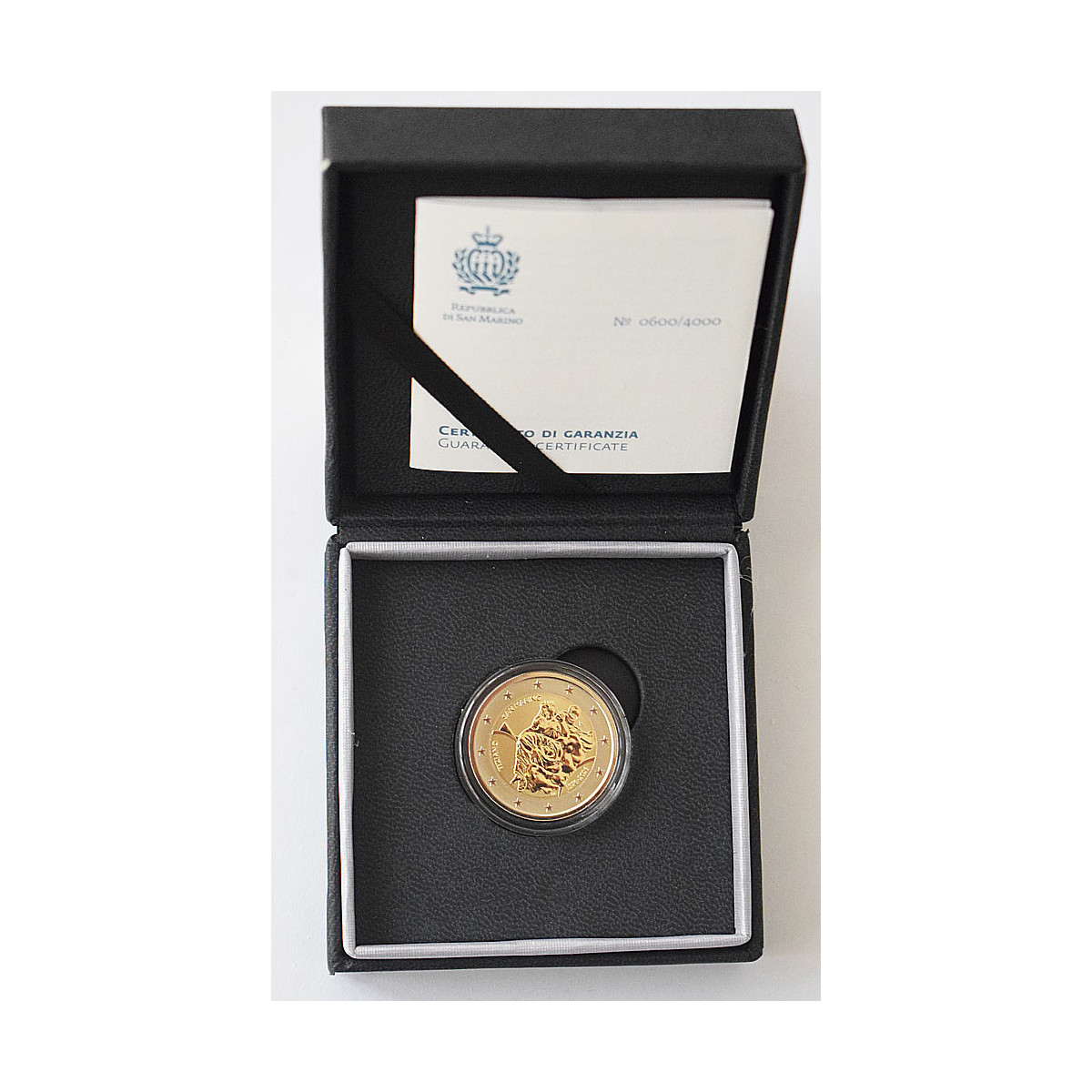 Pamätná 2 Euro minca San Marína, emitovaná v roku 2026. Táto zberateľská eurominca bola vydaná pri príležitosti 450. výročia úmrtia Tiziana Vecelliho, jedného z najvýznamnejších talianskych renesančných maliarov v prevedení reverzná Proof s certifikátom.