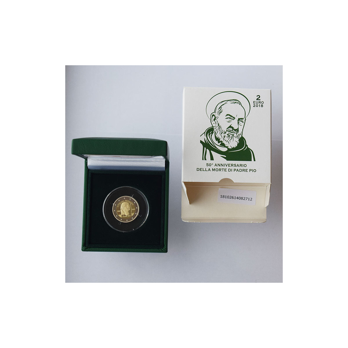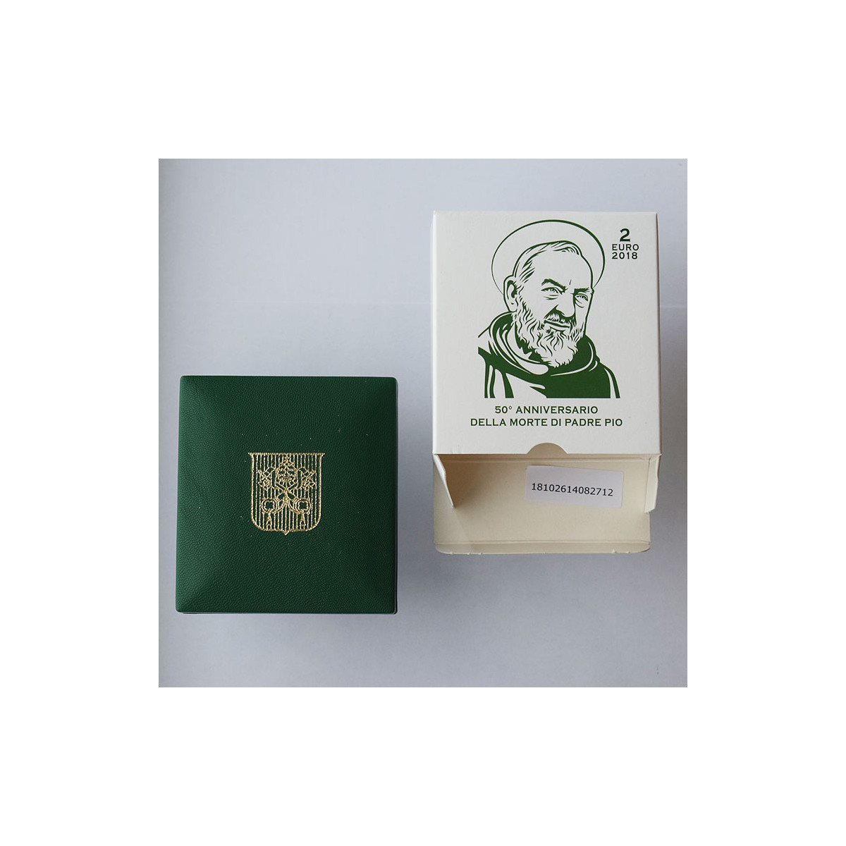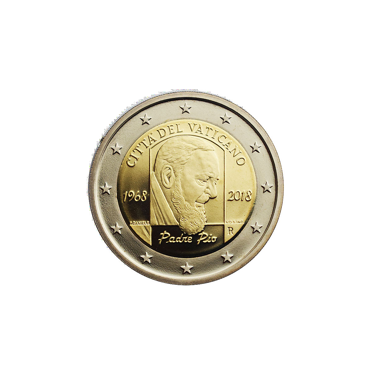 Pamätná 2 Euro minca Vatikánu, emitovaná v roku 2018. Táto zberateľská eurominca bola vydaná pri príležitosti 50. výročia úmrtia pátra Pia v Proof kvalite.