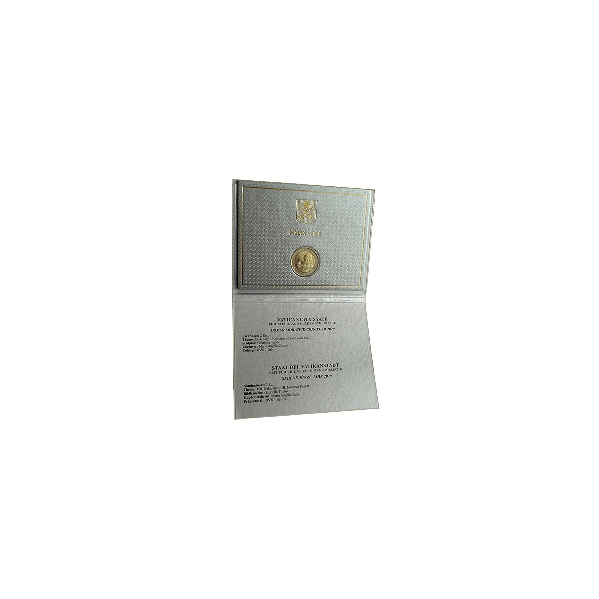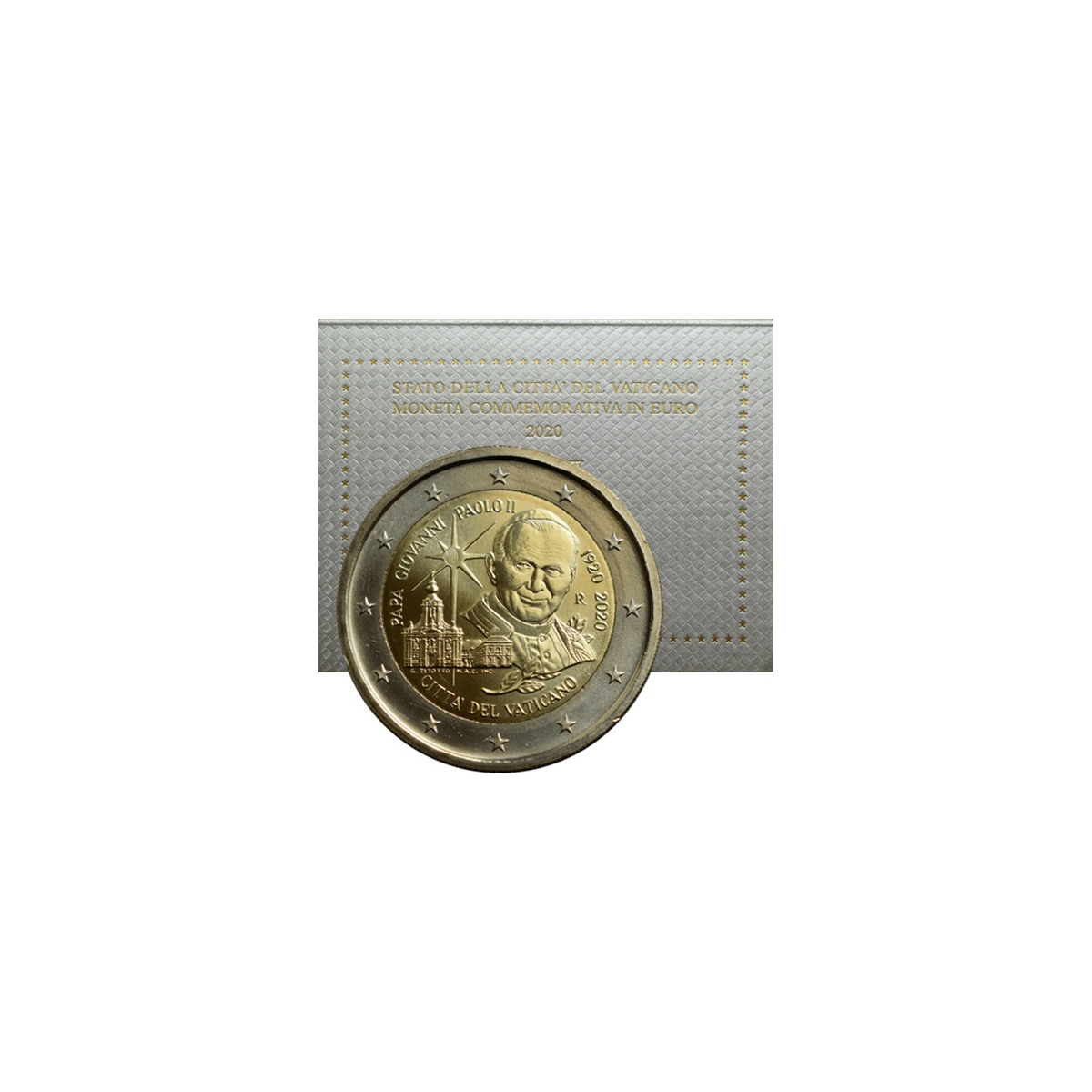Pamätná 2 Euro minca Vatikánu, emitovaná v roku 2020. Táto zberateľská eurominca bola vydaná pri príležitosti 100. výročia narodenia pápeža Jána Pavla II.
