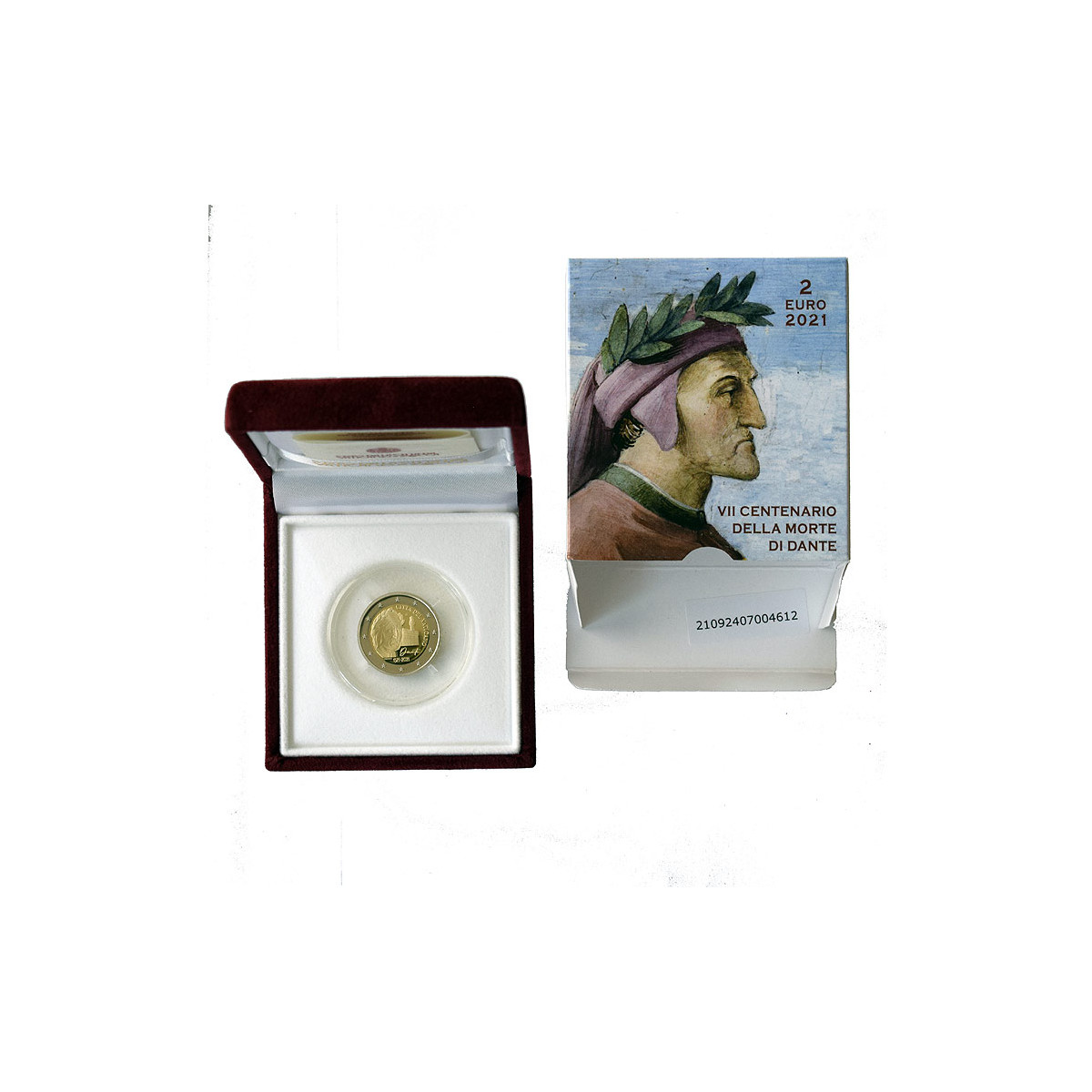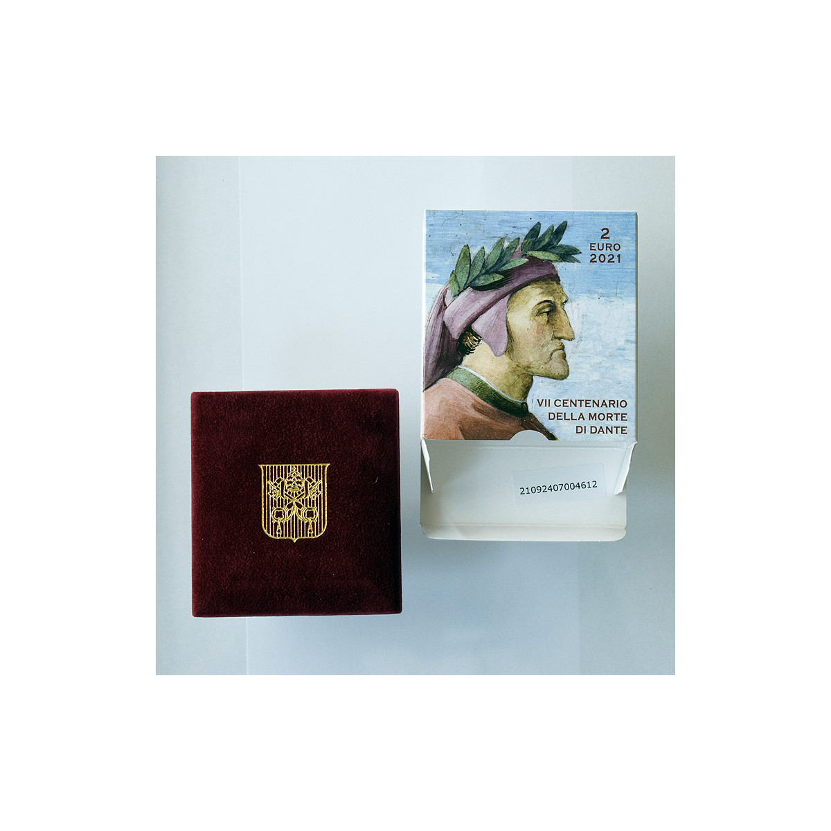 Pamätná 2 Euro minca Vatikánu, emitovaná v roku 2021. Táto zberateľská eurominca bola vydaná pri príležitosti 700. výročia úmrtia Dante Alighieriho, v proof kvalite.