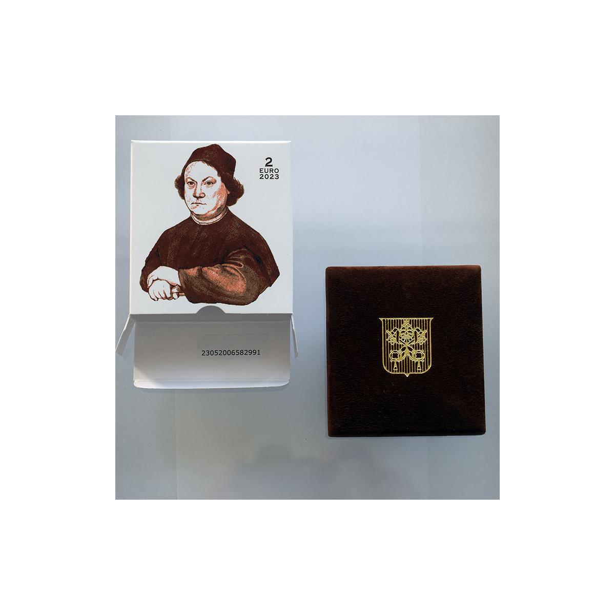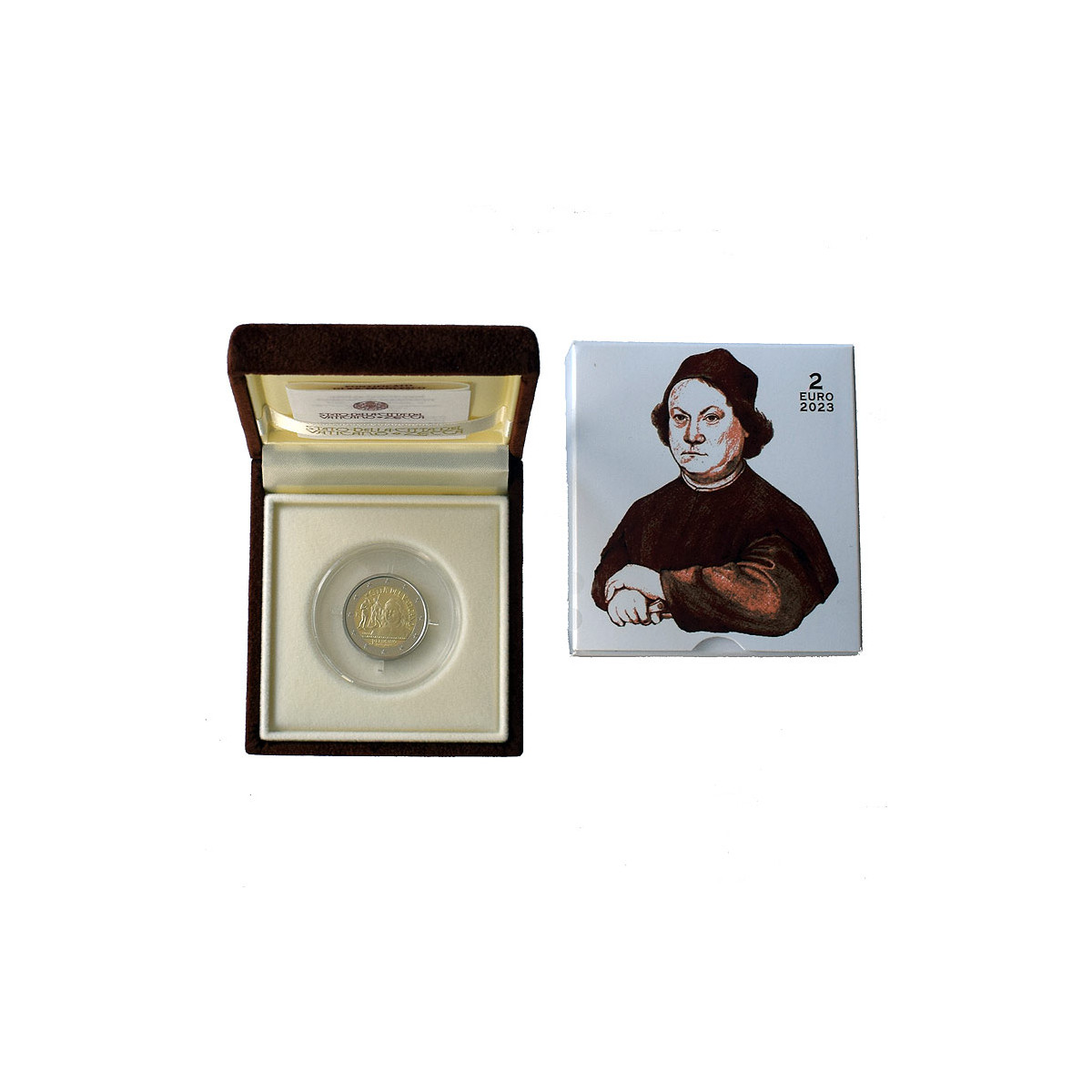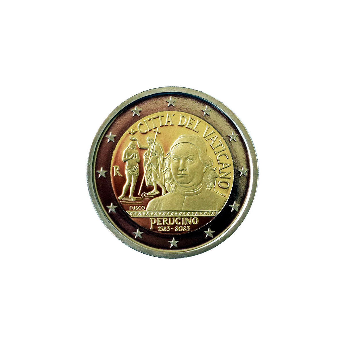 Pamätná 2 Euro minca Vatikánu, emitovaná v roku 2023. Táto zberateľská eurominca bola vydaná pri príležitosti 500. výročia úmrtia Pietra Perugina, talianskeho renesančného maliara, v kvalite Proof.