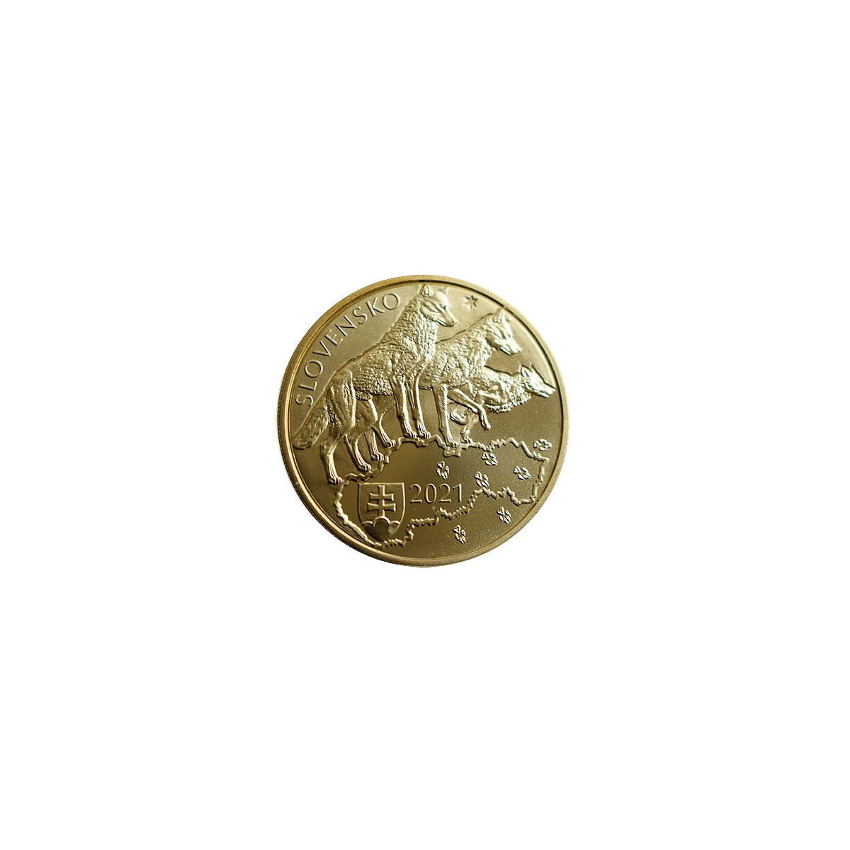 Na líci zberateľskej euromince je vyobrazenie mapy Slovenskej republiky so štátnym znakom SR a letopočtom 2021. Nad mapou stoja traja vlci.