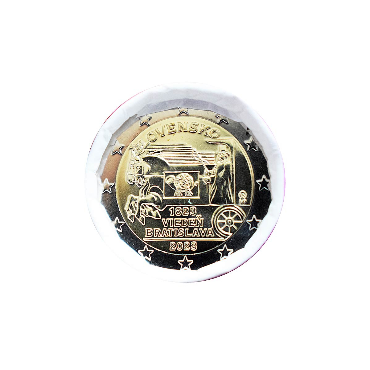 Pamätná 2 Euro minca Slovenska r. 2023 vydaná pri príležitosti 200. výročia začiatku pravidelnej expresnej pošty ťahanej koňmi na trase Viedeň-Bratislava.