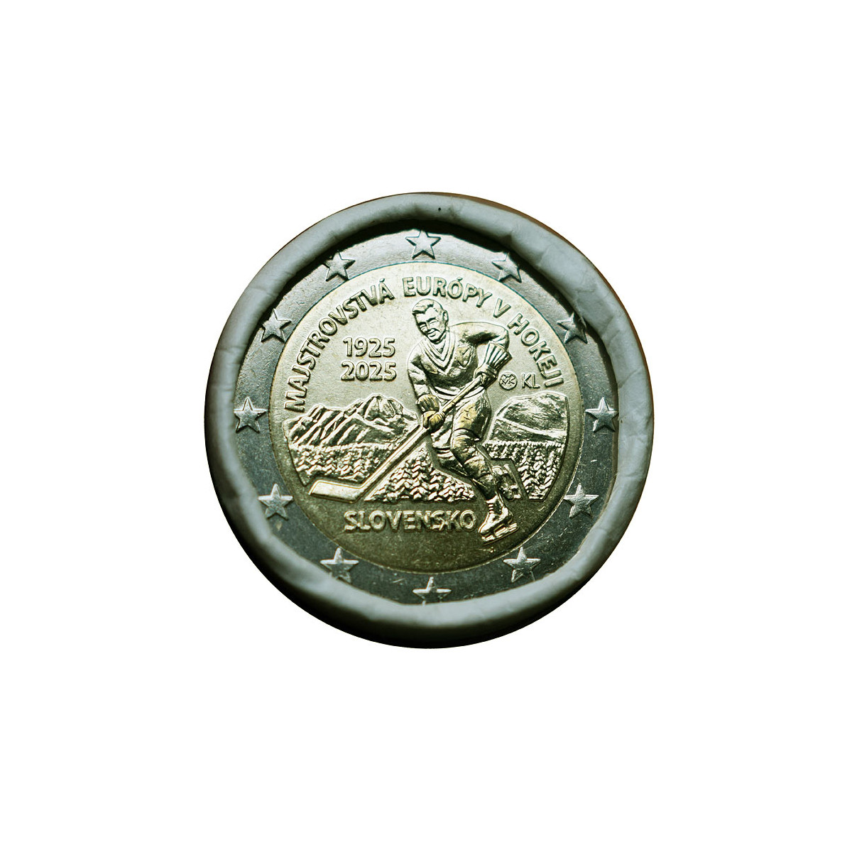 Pamätná 2 Euro minca Slovenska, emitovaná v roku 2025. Táto zberateľská eurominca bola vydaná pri príležitosti uplynutia 100 rokov od konania prvého medzinárodného športového turnaja na území SR s názvom Majstrovstvá Európy v hokeji.